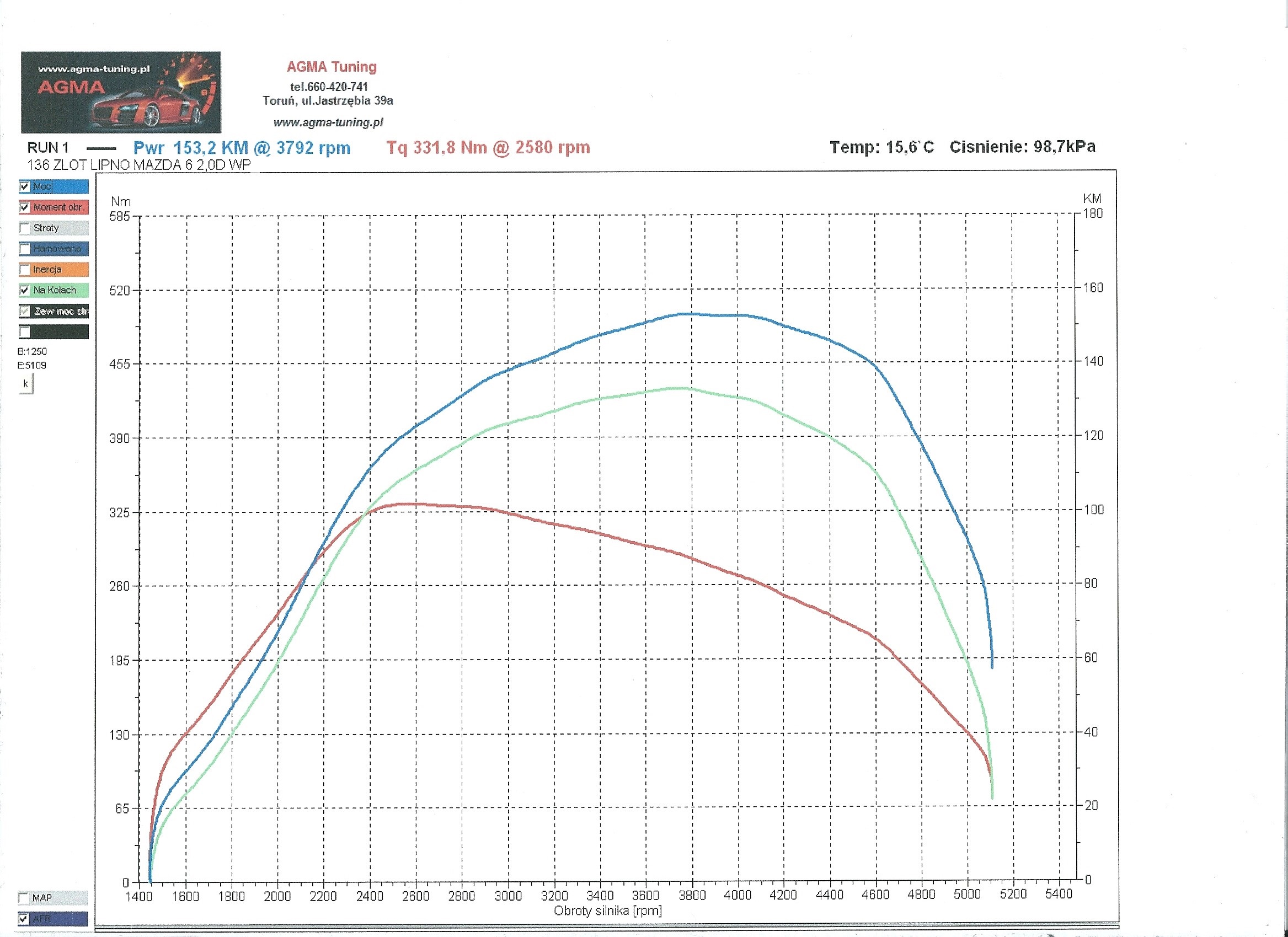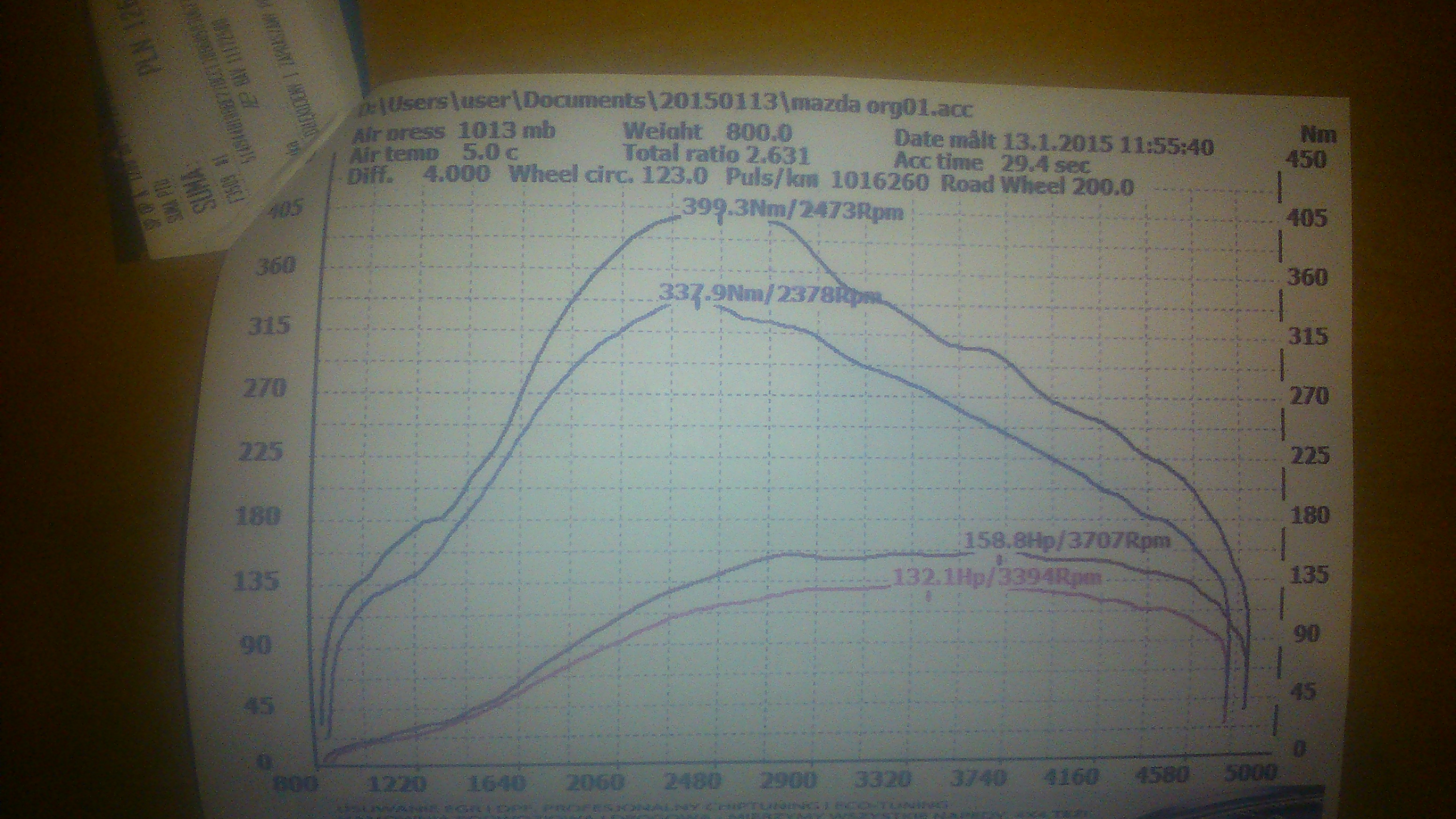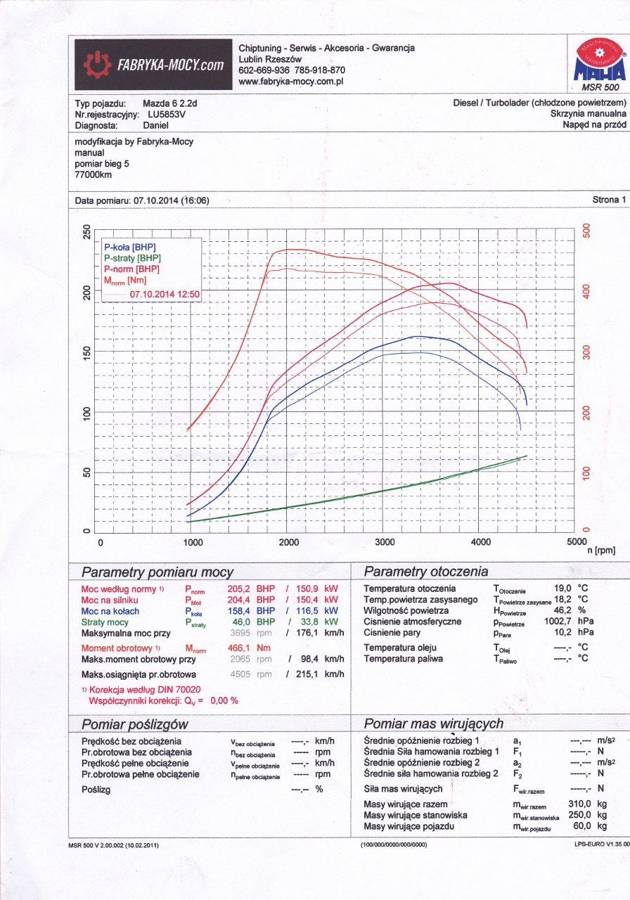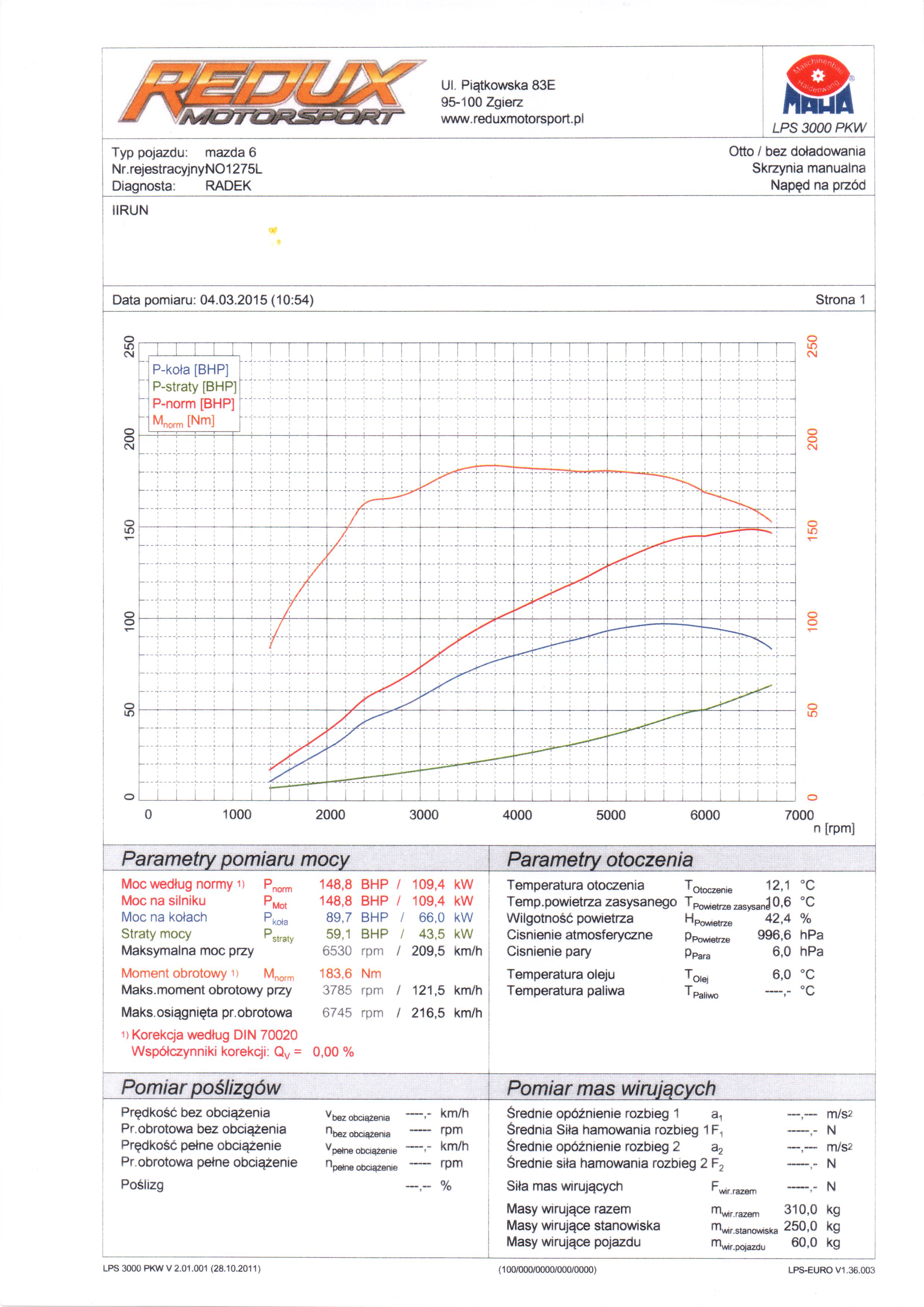 Auto: Mazda5 2.0 benzyna 145KM/185Nm 2006r. Modyfikacje: filtr powietrza (wkład SIMOTA) Wynik pomiaru: 147,5 KM/194,8 Nm Uwagi: auto po kapitalnym remoncie silnika (nowe pierścienie,regenerowana głowica i zawory, honowane tłoki, na dotarciu już po 3000km ) Przebieg: 190tyś km