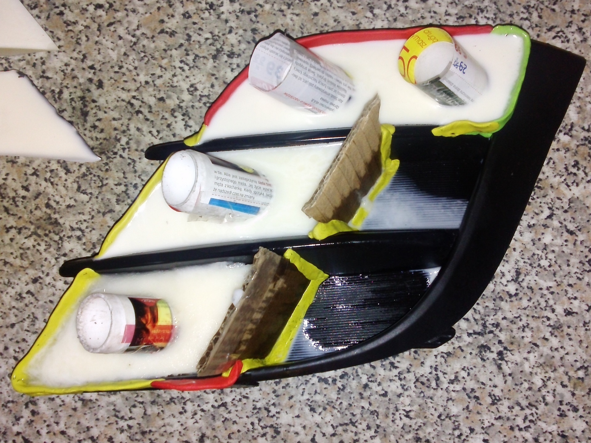 Od samego początku nie było łatwo, gdyż wybór materiału, który jest lekko elastyczny i będzie się trzymał polipropylenu był wyzwaniem. Ostatecznie wybór padł na żywicę odlewniczą FC52. Możliwe, że gdybym robił kształtki jeszcze raz to wyrobiłbym się w opakowaniu 0,5+0,5. Popełniając kilka błędów i przez konieczność poprawek zużyłem 2kg żywicy.