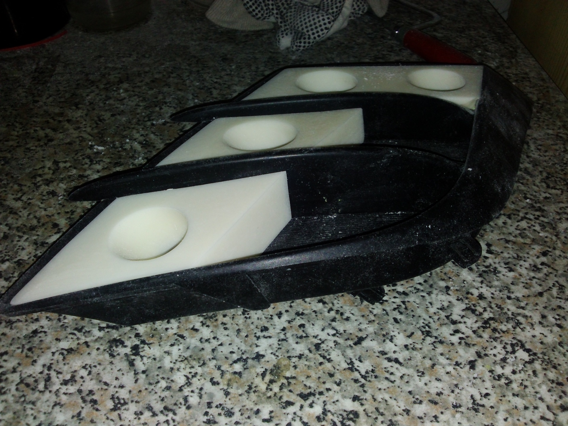 Najpierw trzeba było wyznaczyć kąt pod jakim światła mają świecić, a następnie wywiercić otwory pod diody. Jako symulator diod do formy użyłem znalezionych, przez przypadek, w domu rurek PCV, które mają prawie idealną średnicę jak korpus diody (ok 29mm). Następnie przy użyciu plasteliny wymodelowałem formę, aby można ją było zalać żywicą.