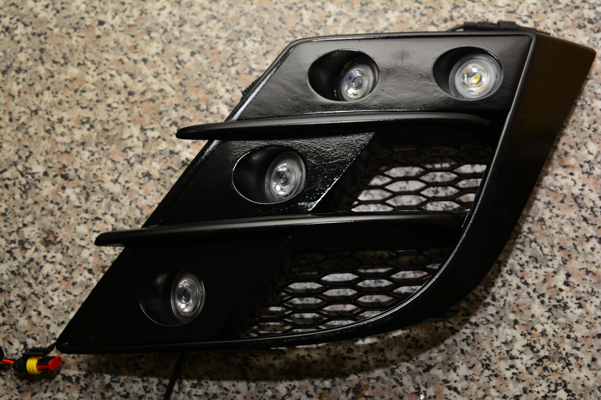 Kształtki, diody i kratkę wkleiłem do zaślepek za pomocą uniwersalnego czarnego silikonu.