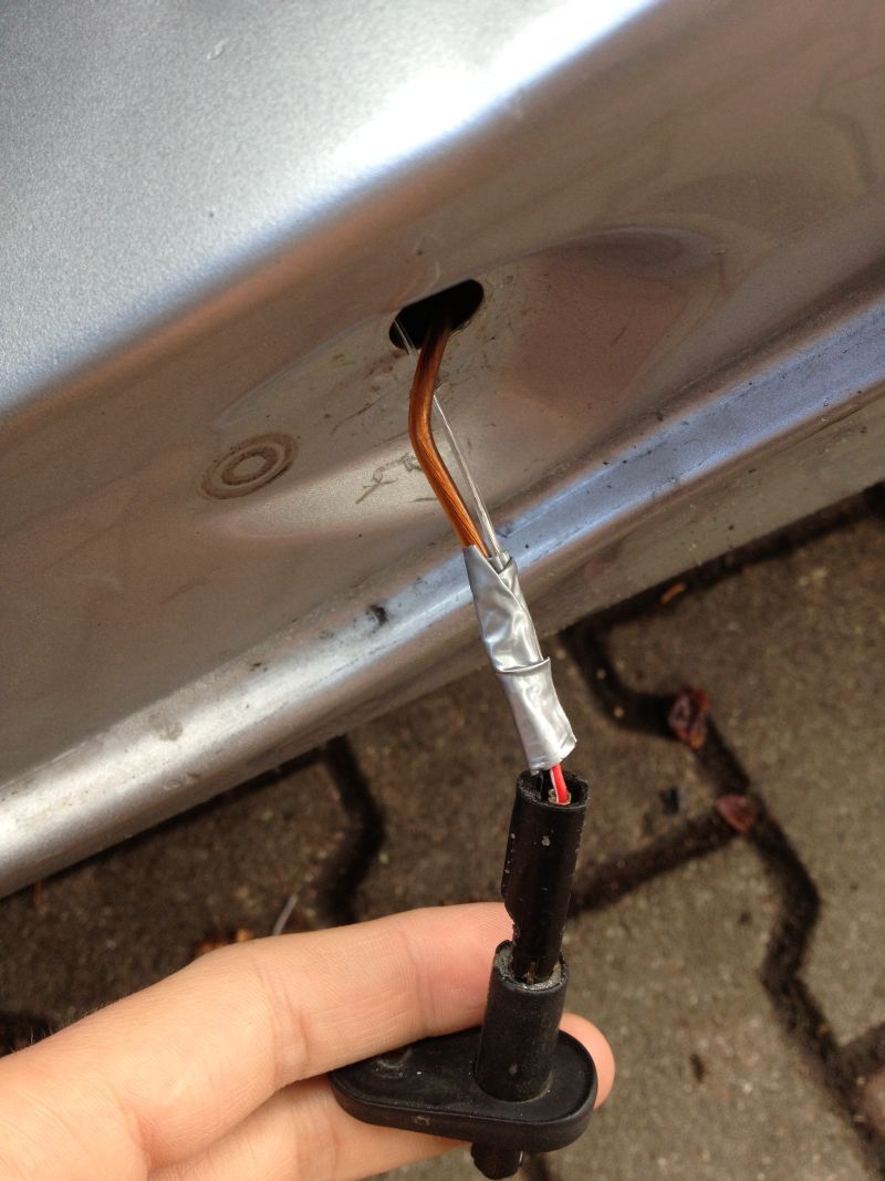 Analogicznie robię to samo od strony pasażera. Tu miałem większy problem, gdyż kabel dochodzący do czujnika był krótki i nie można było go wyciągnąć. Rozciąłem więc kabel jak na zdjęciu i połączyłem dodatkowy kabel.