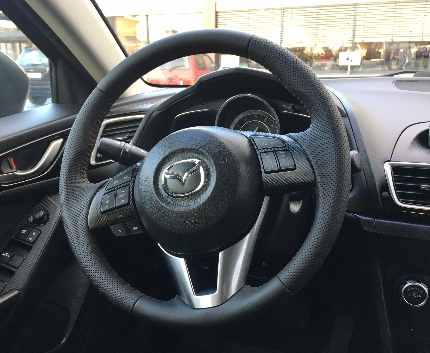Zakupiłem kierownicę z łopatami i dałem do obszycia, zmieniłem gładką skórę na perforację. Zostawiłem ścieg "jodełkowy" by pasował do reszty elementów w samochodzie. Oryginalna skóra mazdy jest moim zdaniem kiepskiej jakości. Różnica jest bardzo duża, kierownica się lepiej trzyma dłoni i ręka się nie poci po 70-80 km. Oceńcie sami :–)