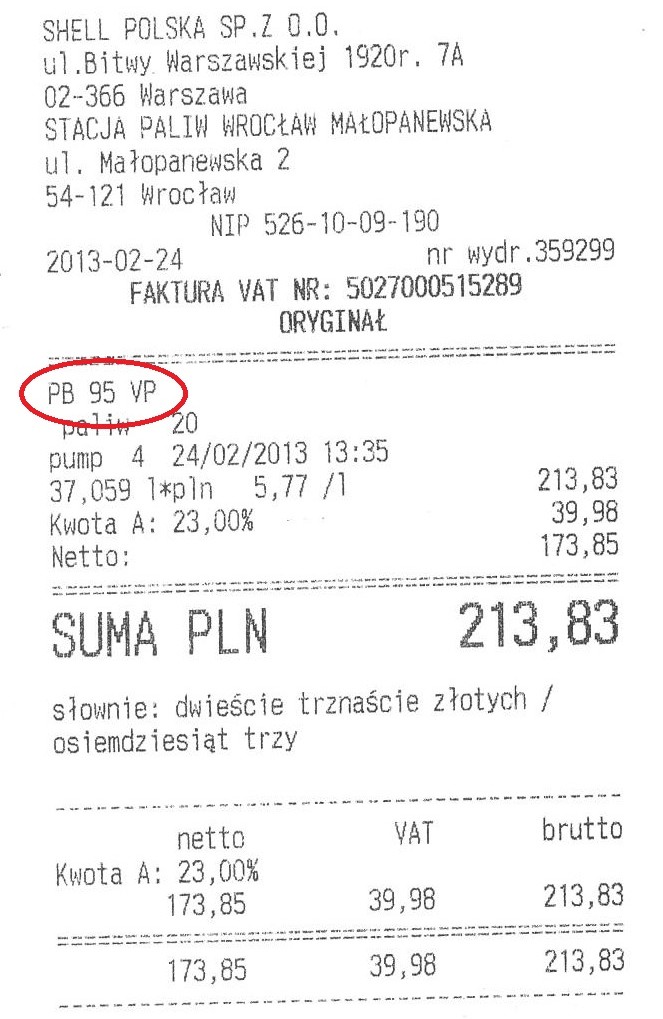 Zwykła V Power ma 95! Popatrz załączony rachunek... Od nowości leje tylko na Shellu i tylko i paliwo. Już myślałem, że sam zgłupiałem. Nie czaruj.