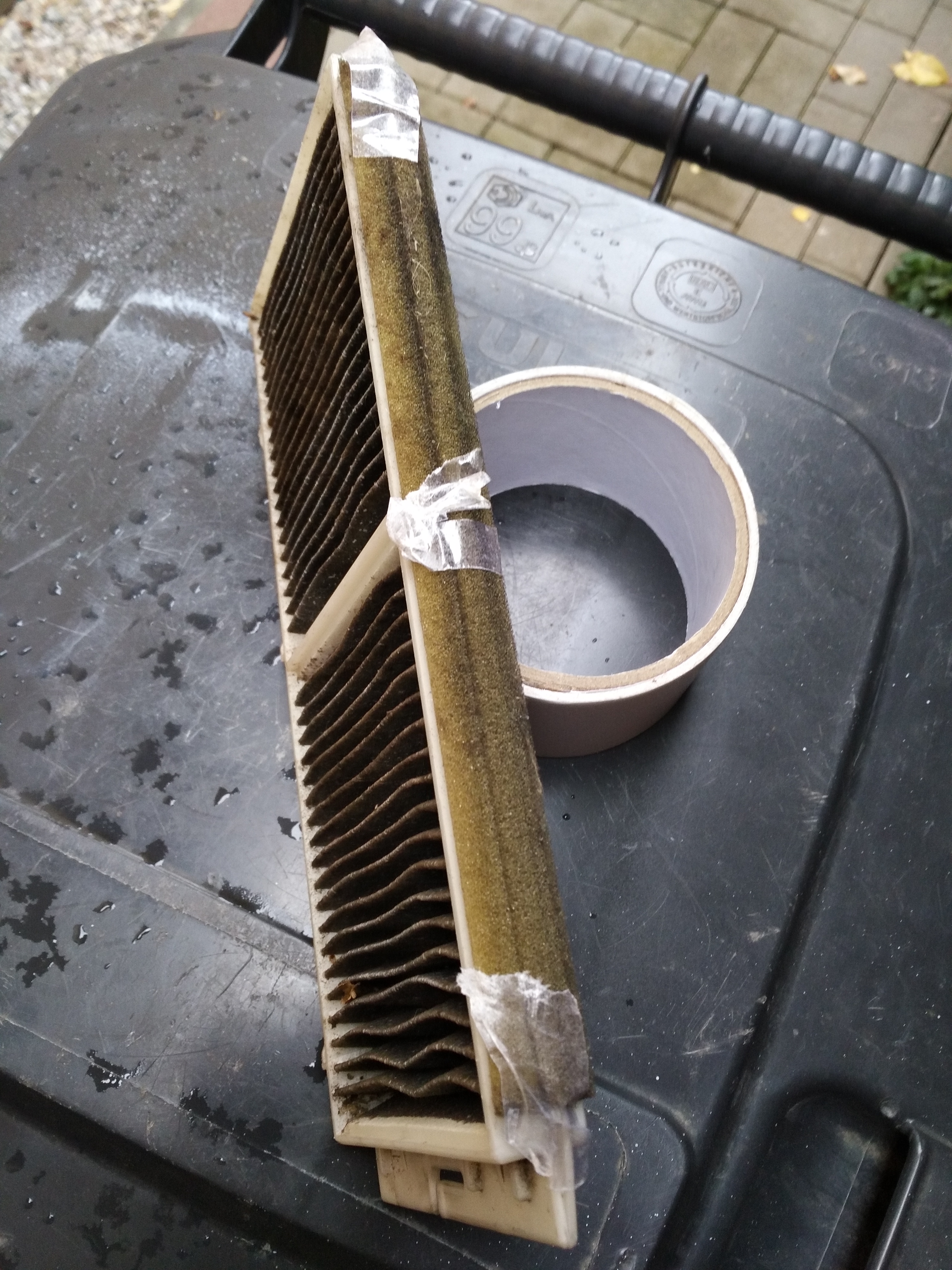 Jak wiadomo wymiana filtra kabinowego dla osób które robią to sporadycznie albo po raz pierwszy stanowi duży problem zarówno fizyczny (trzeba się dużo nagimnastykować) jak i natury manualnej. Wiem, że temat wymiany filtra kabinowego był poruszany na forum i warto skorzystać z opisu i zdjęć tam zamieszczonych (ja również z tego korzystam). Problem jest natury manualnej przy samym końcu wymiany filtra. Otóż jak wiadomo filtr składa się z 2 części. Pierwszą część wkłada się w otwór i podnosi do góry aby zrobić miejsce dla drugiej części filtra. I tutaj zaczyna się problem (przynajmniej ja taki miałem!, ale już nie mam!), gdyż po wsunięciu pierwszej części filtra ta właśnie część nie chce pozostać w górnej części otworu tylko notorycznie nim wepchnę drugą część opada na dół (może coś źle robię, może w górnej części powinna się o coś zahaczyć i tam pozostać dając miejsce dla drugiej części filtra). Otóż wymyśliłem taki patent dzięki któremu wymieniam tzn. wkładam obie części w 1 min. a potem pozostaje skręcenie obudowy. Po prostu do grzbietu pierwszej części tam gdzie jest gąbka przyklejam trzy kawałeczki taśmy [b]dwustronnie przylepnej. Tak oklejony filtr wsuwam po rowku do komory i podnoszę w górę do samego końca, tam taśma przylepna przykleja filtr , który już nie opada i można załadować drugi. Ot i wszystko PATENT DZIAŁA!!!!!!
