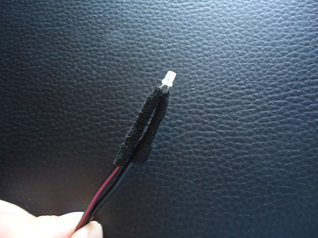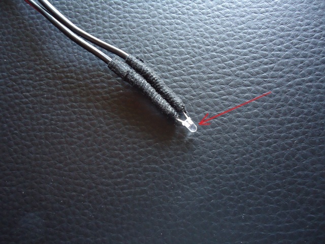 4. Lutujemy diodę do przewodu, ładnie izolujemy i piłujemy (papier ścierny, pilnik)na kształt walca żeby światło było rozproszone a nie świeciło w punkt.