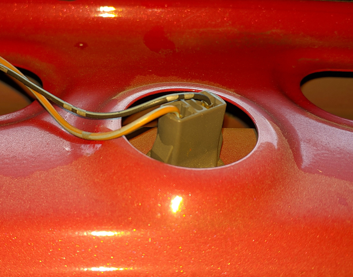 4. Wracamy do bagażnika. Sprawdzamy, które kable prowadzą do oświetlenia żarówki (w moim przypadku jest to pomarańczowy z paskiem i jedną kropką oraz czarny z paskiem i dwiema kropkami jak na zdjęciu)