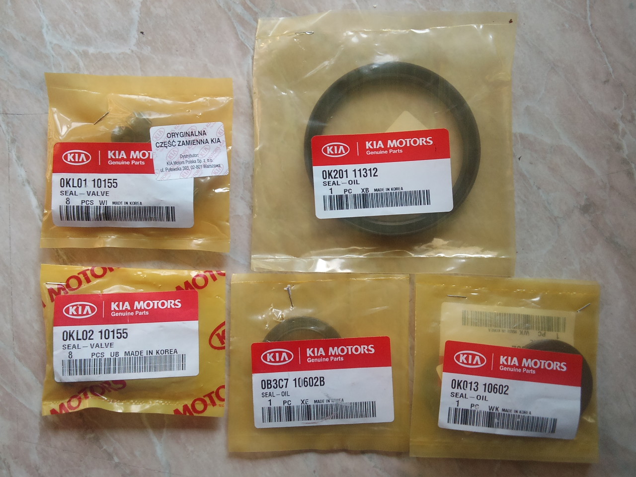 Kupiłem je wysyłkowo w sklepie Beraf, okazało się że mają dostęp do oryginałów Kia i ceny takie same jak podawałeś czyli 5,57 zł za zaworowy, 16,30 zł wałka rozrządu. Dostałem minimalnie lepsze ceny na pierścienie RIK 30275, a mianowicie 165 zł i pasek Mitsuboshi i rolki GMB 145 zł. Poniżej foto uszczelniaczy. Myślę, że są lepszej jakości niż np. Takoma bo w końcu to oryginały. Dodam jeszcze, że na razie pali mi ok. 0,7 l oleju na 1000 km (część z tego wycieka z obu stron wału i spod pokrywy zaworów), a poza tym rozrząd był ostatnio wymieniany 137 tys. km temu