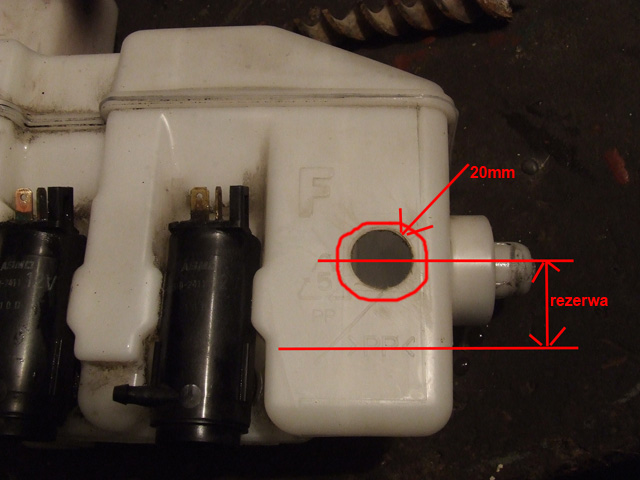 Nawiązując do fotorelacji,ja u siebie otwór wykręciłem ok. 5-7mm niżej niż jest pokazane na zdjęciu.Rezerwa zapala się dokładnie wtedy gdy płynu jest 0.6 litra.Obliczyłem,że zbiornik ma pojemność ok.2.2 do 2.3litra.