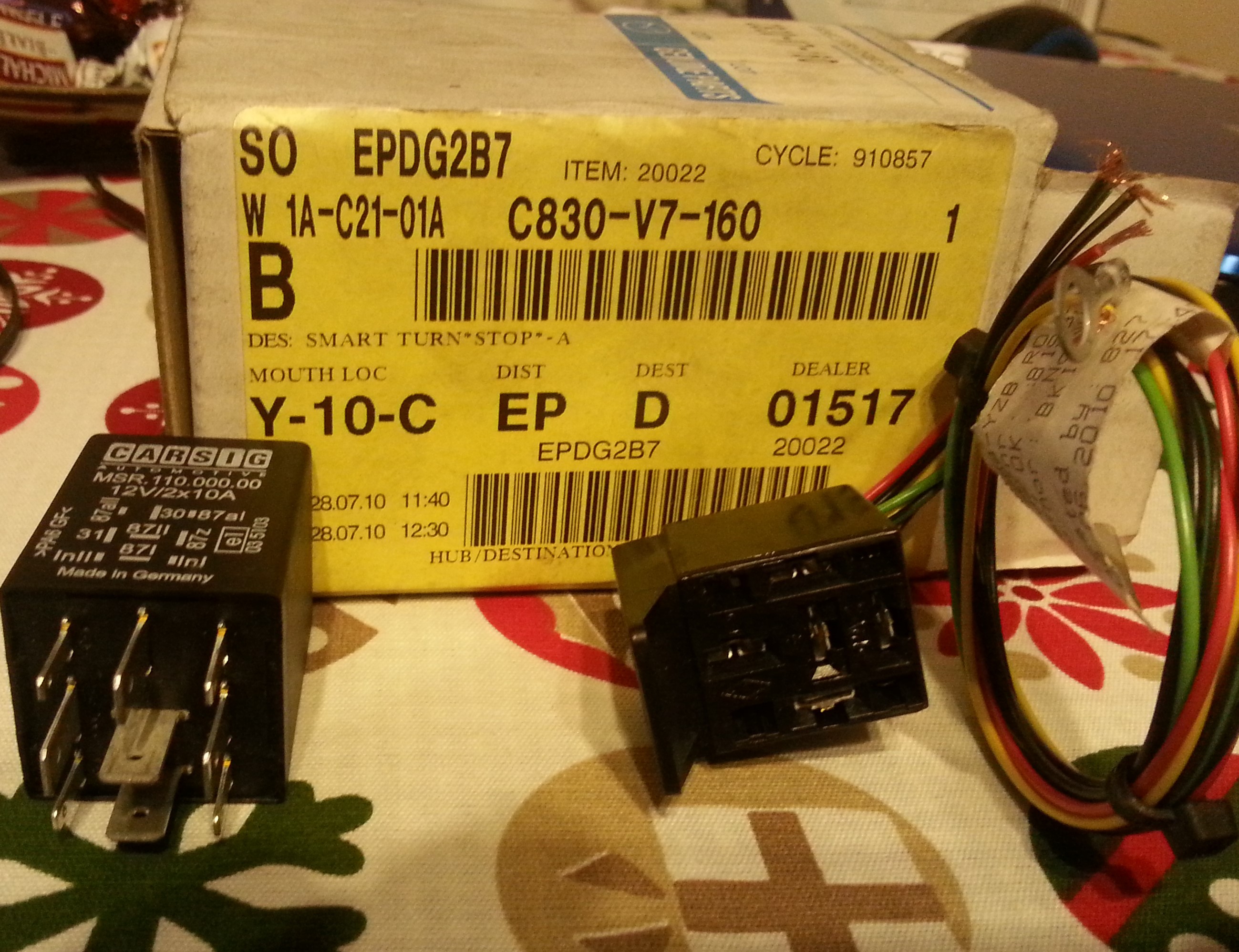 Odnośnie samego modułu to jest to przekaźnik czasowy, który wpina się szeregowo w istniejącą już instalacją. Polega to na przecięciu 2 kabli w obwodzie kierunkowskazów i wpięcie przekaźnika szeregowo, podłączeniu zasilania stałego idącego z akumulatora i masy do nadwozia. Wszystko to w okolicy skrzynki bezpieczników w kabinie przy nogach po lewej stronie nadwozia. Wszystko jest ładnie rozpisane w załączonej instrukcji: gdzie ciąć, co z czym łączyć, według jakich kolorów. Zestaw zawiera przekaźnik, podstawkę pod niego wraz z kablami przygotowanymi do montażu, konektorki do łączenia przewodów (zagniatane), 3 opaski zaciskowe i piankę samoprzylepną do oklejenia przekaźnika z podstawką aby nie tłukł się o coś w kokpicie. Całość roboty to około 1.5 godziny jak chce się zrobić jak z fabryki (lutowanie, rurki termokurczliwe) lub mniej niż godzina (na skrętkę lub z użyciem w/w konektorków, taśma izolacyjna). Sam moduł nie powinien kosztować więcej niż 230zł (sam tyle zapłaciłem).