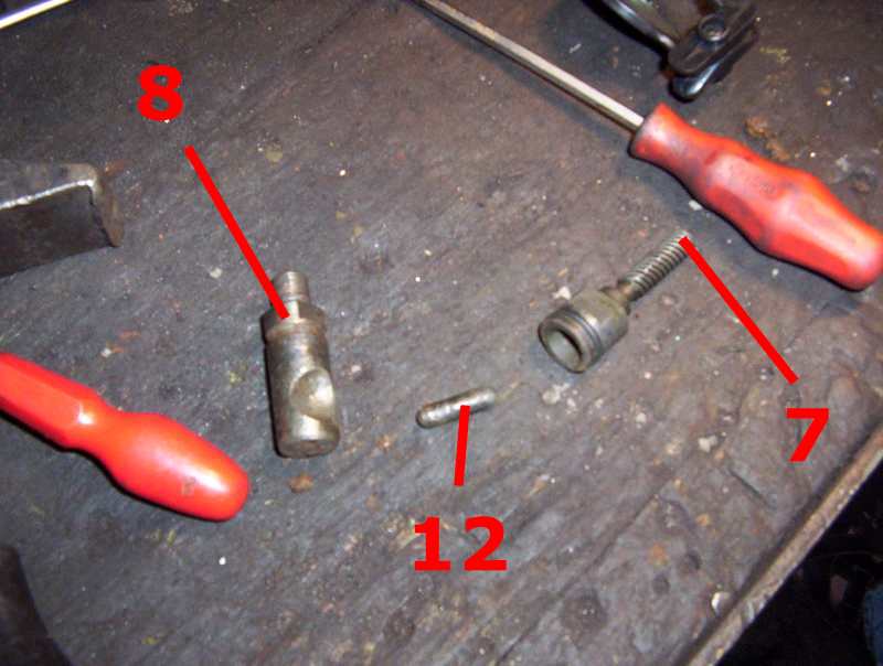 Po wykręceniu tłoczka (1) ze sworznia urządzenia regulacyjnego (7) (inaczej mówiąc to jest gwintowany sworzeń na którym tłoczek się porusza w górę i w dół), należy wyjąć blaszkę oporową (5), wpasowana w otowry ustalające (9). Następnie należy wyjąć cały sworzeń na którym porusza się tłoczek (7) – jest on po prostu wpuszczony w otwór, ma na sobie uszczelkę tak więc należy go wyciągnąć używając trochę siły. UWAGA! Aby nie uszkodzić gwintu na sworzniu (bo niestety za gwint będziecie najprawdopodbniej łapali szczypcami – podłóżcie coś pomiędzy). Po wyjęciu sworznia bedziecie mieli taki obrazek (10 – tu znajdował się sworzeń, te otwory po bokach to otwory ustlające (9) blaszkę oporową (5)).