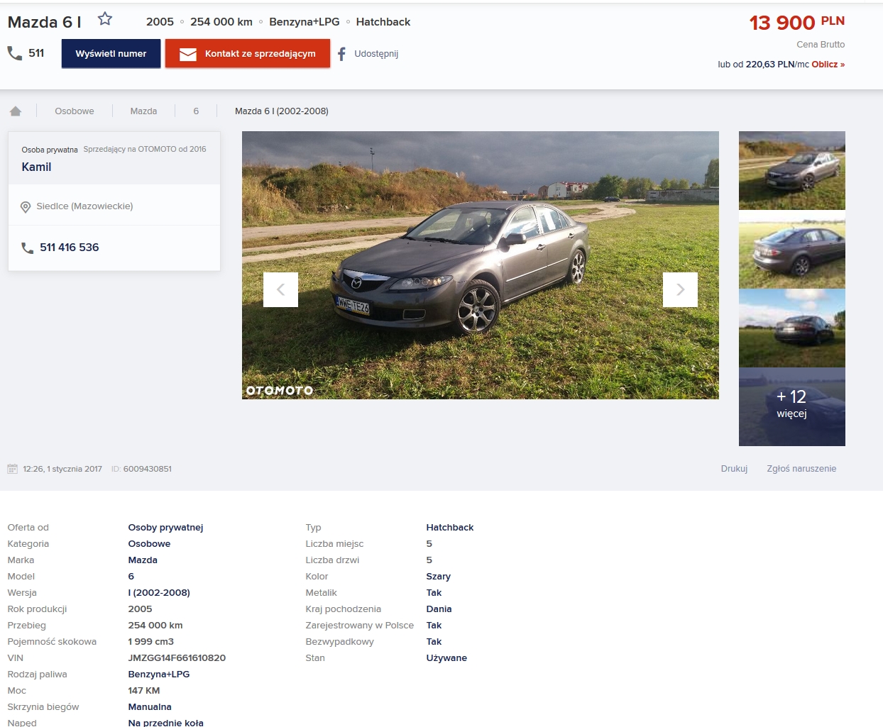 Mazda6, JMZGG14F661610820, (otomoto: 6009430851), oferta prywatna Siedlce, 511416536.