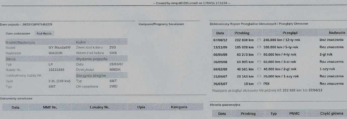 Licznik cofnięty około 100 000 km. Na aukcji sprzedający deklaruje przebieg 170 000 a po sprawdzeniu w ASO Mazda już w 2012 roku było 240 000!! Pewnie dobite do 300 000. Szok, jak nas w biały dzień, w żywe oczy próbują oc[tiit]ać
