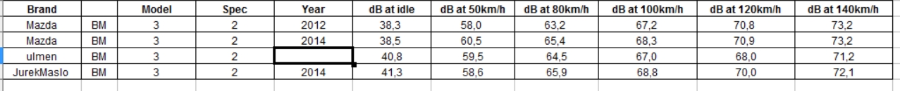 Poniżej pomiary z bazy "hałasu" (http://www.auto-decibel-db.com/index.html)