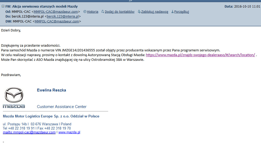 widać nie trzeba było się tym przejmować tak jak robi to teraz Mazda wprowadzając akcję dla tak starych aut tylko dlatego że coś być może może się stać ale nie musi. To tylko działa na ich plus.