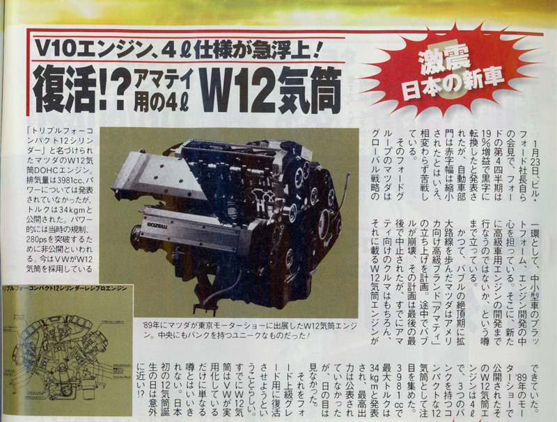 Pojawia się tutaj chyba największa dla mnie niespodzianka, związana z tym tematem – Mazdowski silnik o pojemności czterech litrów i posiadający wspomniane dwanaście tłoków. W postach osób, które wcześniej zajęły się tym tematem można trafić na skan z 1989 roku, który pokazuje taki silnik jak żywy: