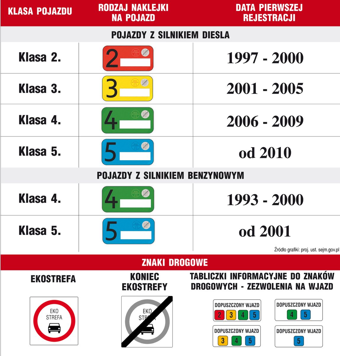 Kontrowersje budzi jednak przyznawania kolorów naklejek, które decydować będą, jak daleko dojedziemy. Będzie to zależne od rodzaj paliwa i daty pierwszej rejestracji. Najgorzej będą mieli właściciele diesli. Samochody z takimi silnikami z lat 1997 – 2001 dostaną naklejkę czerwoną, żółta przypadnie tym z lat 2001 – 2006, a zielona – 2006 – 2010. Auta z silnikiem wysokoprężnym, zarejestrowane po 2010 roku, będą w najwyższej klasie. Zakaz wjazdu do ekostref będą miały wszystkie diesle wyprodukowane przed 1997 rokiem i wszystkie auta benzynowe sprzed 1993 roku. Auta benzynowe zarejestrowane po 1993 roku trafią do klasy czwartej z zieloną naklejką, a z niebieską do piątej te zarejestrowane po 2001 roku. Koszt naklejki to 10 złotych. Będą one jednolite dla wszystkich miast. Jednak z czasem trzeba będzie je wymieniać, gdy nasz pojazd będzie przechodził do kolejnych klas.