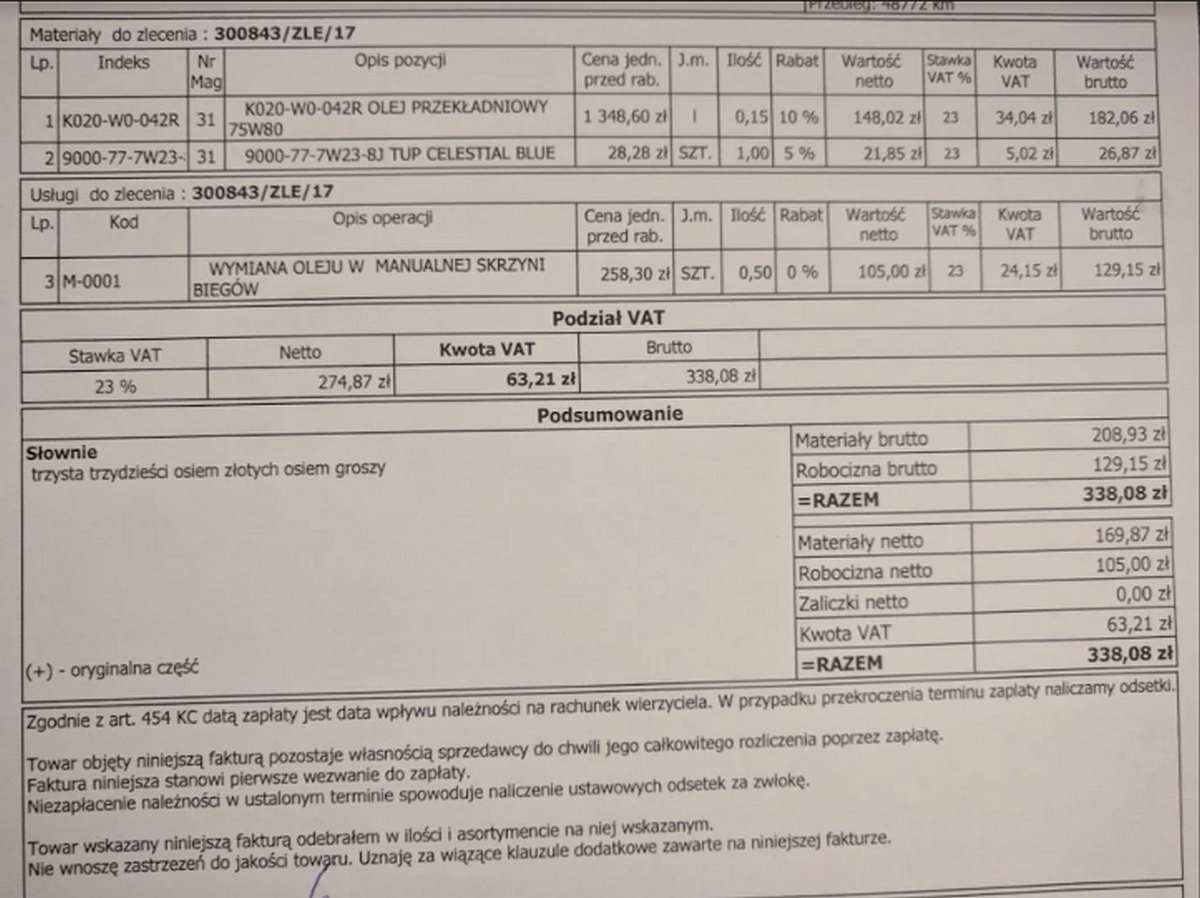 Pozostała kwestia wymiany oleju w skrzyni biegów. Nie wiem z czego to wynika, że nie została zalana odpowiednia ilość oleju. Niedopatrzenie mogłoby przyczynić się do rozległej awarii samej skrzyni biegów.