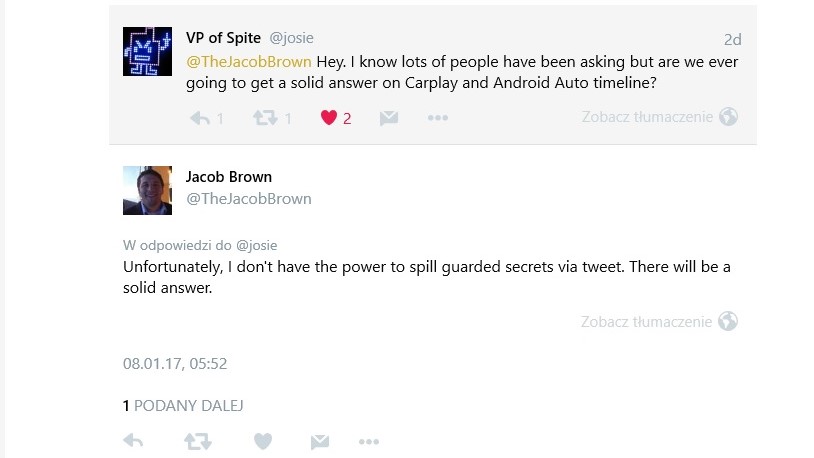 "Apple CarPlay pojawi się w naszych samochodach za kilka miesięcy. Trwają ostatnie prace nad wdrożeniem. Zachęcamy do obserwowania naszej strony na bieżąco, gdzie będziemy informować o wszelkich nowościach. Pozdrawiamy."