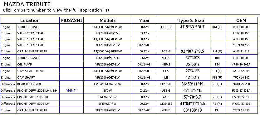 Prawdopodobnie do Tributa będzie pasować uszczelka od Forda Maverica, to bliźniaczy model w Europie (w USA Escape). Oznaczenie 5L8Z-4B416-AA , serwis podaje jeszcze inne oznaczenie 4656029. Cena w porównaniu do mazdowskiej to tylko 65zł.