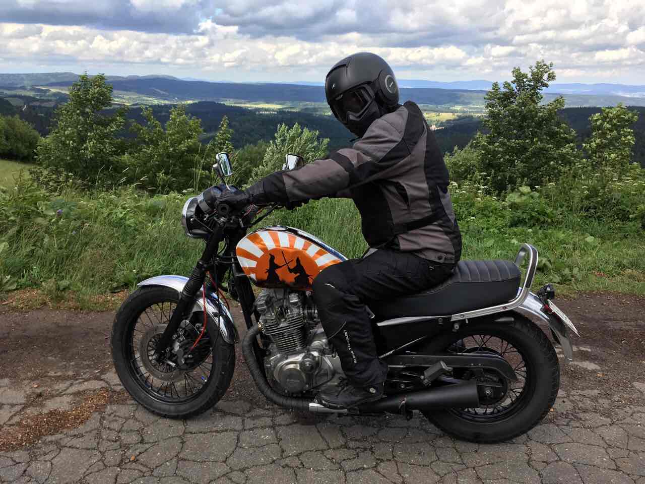 Tak mała owiewka osłaniała cały tors. Jak bym zastosował 5-7 cm wyższą nie dmuchało by mi w szyję i szybkę kasku. Metodą prób i błędów (takie czasy) dobierałem pochył do momentu aż było dobrze t.zn. brak drgań szybki przy większej prędkości, braku świstu i odpowiedniej osłonie torsu.