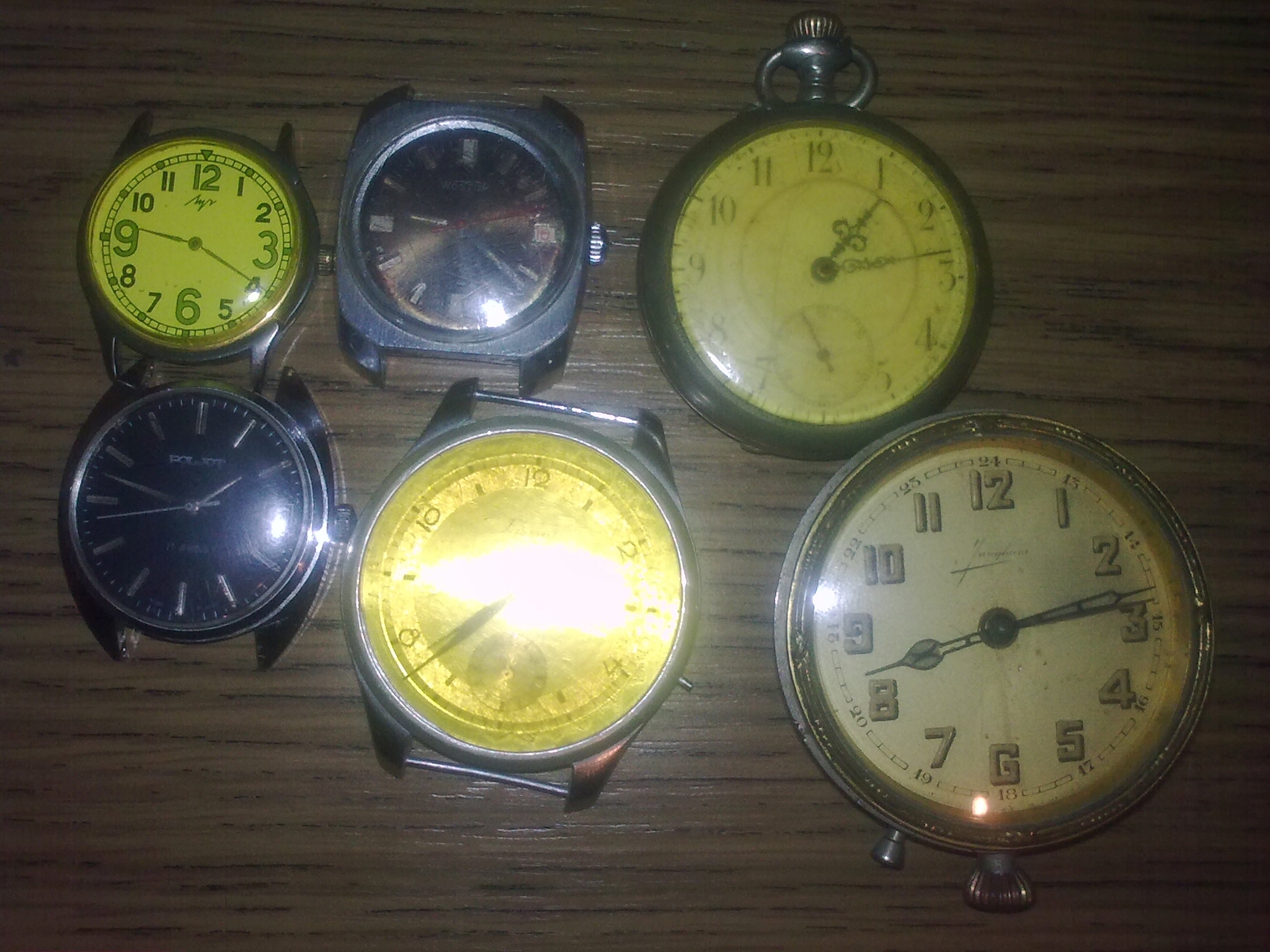 Prawdopodobnie Pobieda, Wostok, Poljot, Tissot. Junghaus i jeden nieznany to kieszonkowce.