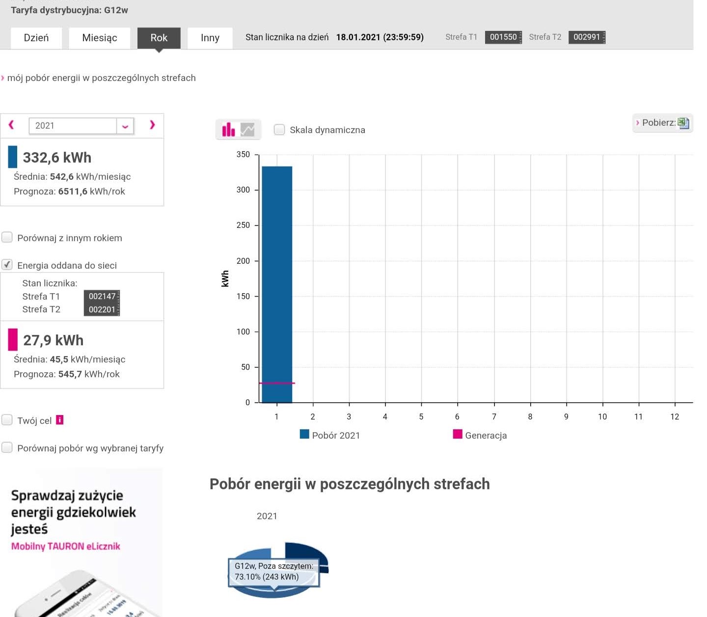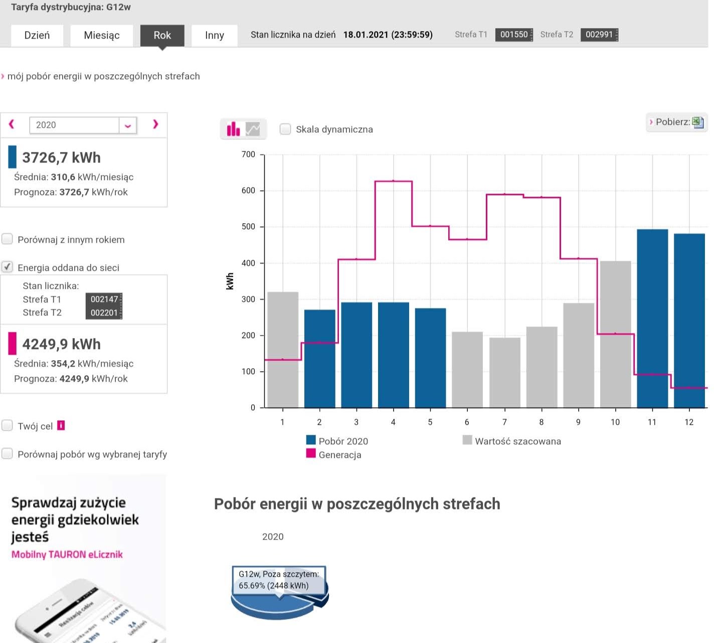 Ogólnie to jestem zadowolony – zużycie 33% w pierwszej taryfie (1200kWh), 66% w drugiej (2400kWh) – zapłaciłem 230zl opłat licznikowych