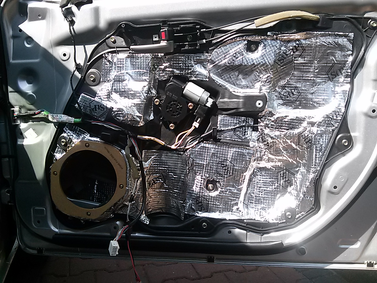 zakupiłem 6 mat STP silver 75x50 i wygłuszyłem częściowo przednie drzwi, mat starczyło na wygłuszenie blach wewnątrz, niestety zabrakło na plastikowe osłonę, jedynie od wewnątrz wykleiłem pianki. Muszę dokupić jeszcze dwie maty STP i piankę na tapicerkę.