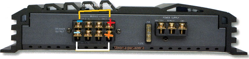 lucky, niestety mój wzmak jest mostkowany na 2 kanały nie na 1 więc taka opcja odpada. Poza tym zasila on 2 głośniki nie jeden. W radiu mam wyjście rear(czerwone +białe)+ subwoofer
