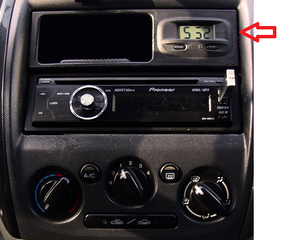 Po zmianie radia z fabrycznego na lepsze lukę w desce wypełniłem oryginalnym zegarkiem z BJ i faktycznie, wszystko łącznie z radiem czerwone, tylko ten zegarek daje po oczach zielenią... Wystarczy go wyjąć, odkręcić 2 śrubki i potem płytka sama zejdzie jak się ją delikatnie pociągnie. Z wyświetlacza na obudowie wyjmujemy zielony plastik, który nadawał barwę zegarkowi, bo oryginalna żarówka jest biała. Nic tam już nie wkładamy, chyba, ze ktoś chciałby pokombinować. Teraz wystarczy sprawić, żeby żarówka świeciła na czerwono – ja moją pomalowałem czerwonym markerem, wyszło mocno pomarańczowo/lekko czerwono, ale że podświetlenie całej deski rozdzielczej nie jest też jakoś krwiście czerwone to się ładnie skomponowało. Myślę, że jeszcze lepszy efekt uzyska się kupując taką żaróweczkę w żądanym kolorze. Składamy zegarek do kupy, montujemy i cieszymy się z tego że już nic zielonego nie rzuca się na naszej desce w oczy