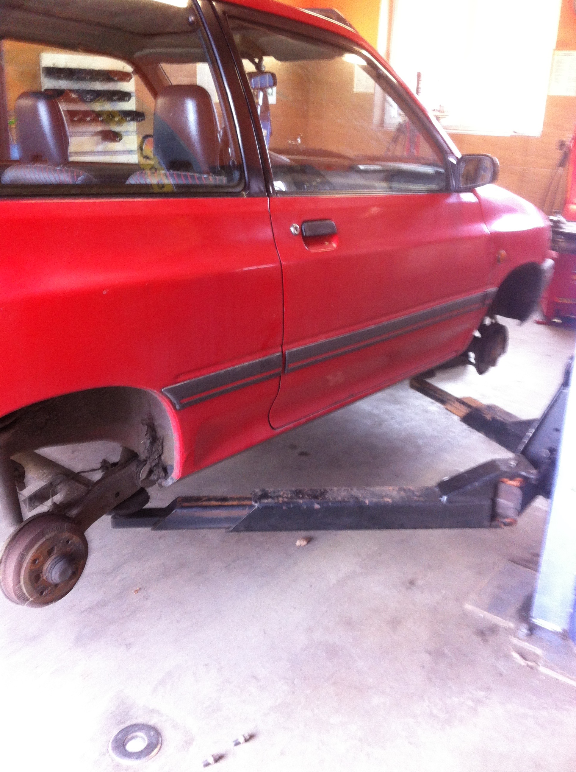 Samochód po zakupie trafił na podnośnik. Podłoga o dziwo w bd stanie. Jedna dziurka koło nóg kierowcy. W jednym miejscu skorodowało nadkole. Na szczęście nie jest to coś, czego nie da się naprawić w jedno popołudnie migomatem. Założyłem mu nowe opony, wyważyłem felgi i pojechałem na przegląd. Taki normalny, bez "dam na flaszkę i Pan podbije". Auto przeszło przegląd bez najmniejszego problemu. Wszystko sprawne. Hamuje, skręca, nie leje się z silnika (za bardzo ;) ) i zawieszenie trzyma się kupy.