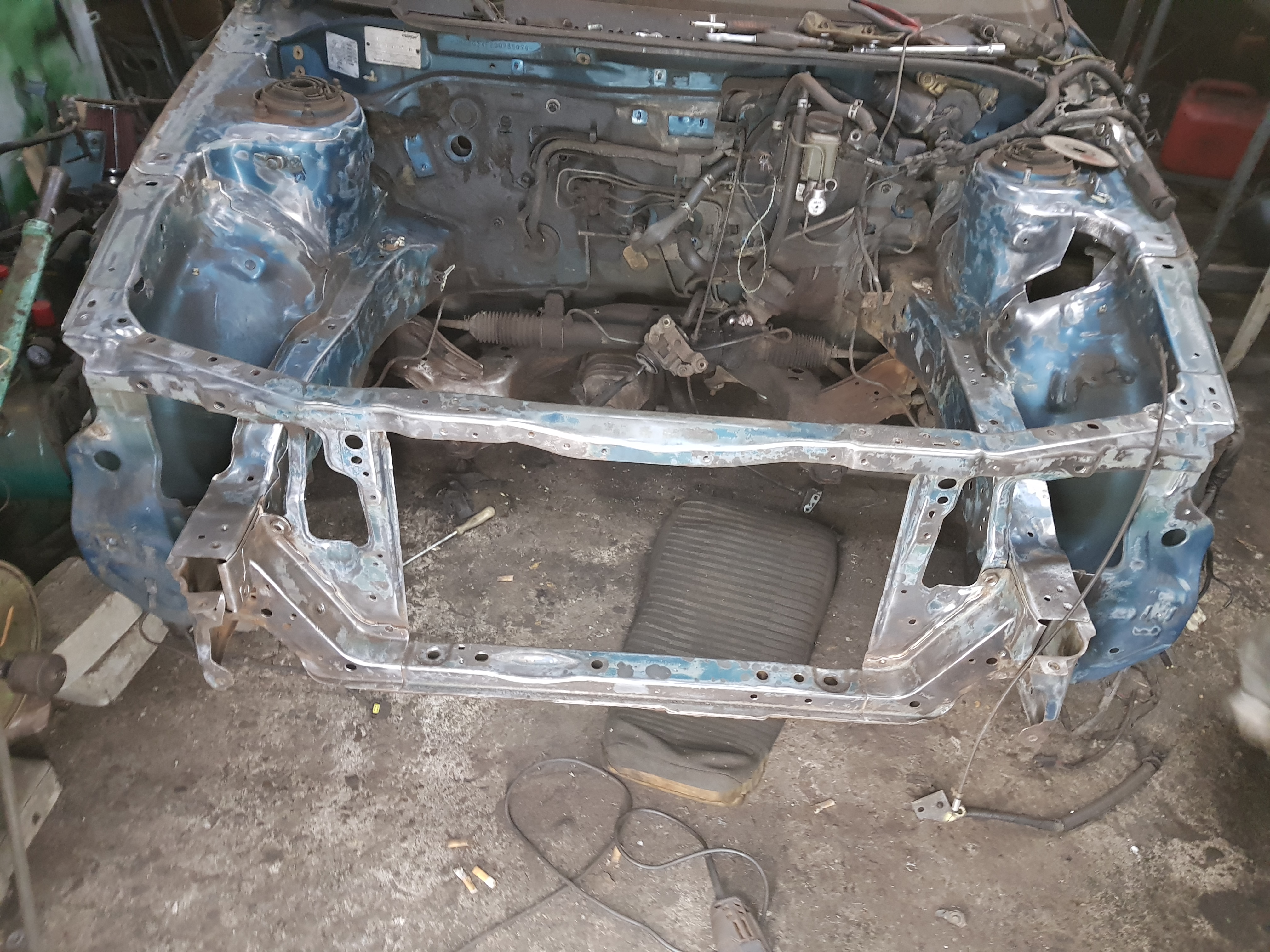 Obecnie trwają przygotowania do instalacji nowego silnika, przy okazji postanowiłem skorzystać z okazji i wyeksmitować rudą z przodu samochodu. Obecnie BaGieta wygląda prawie jak na zdjęciu, z tą różnicą że nie ma belki przedniej i całego zawieszenia.