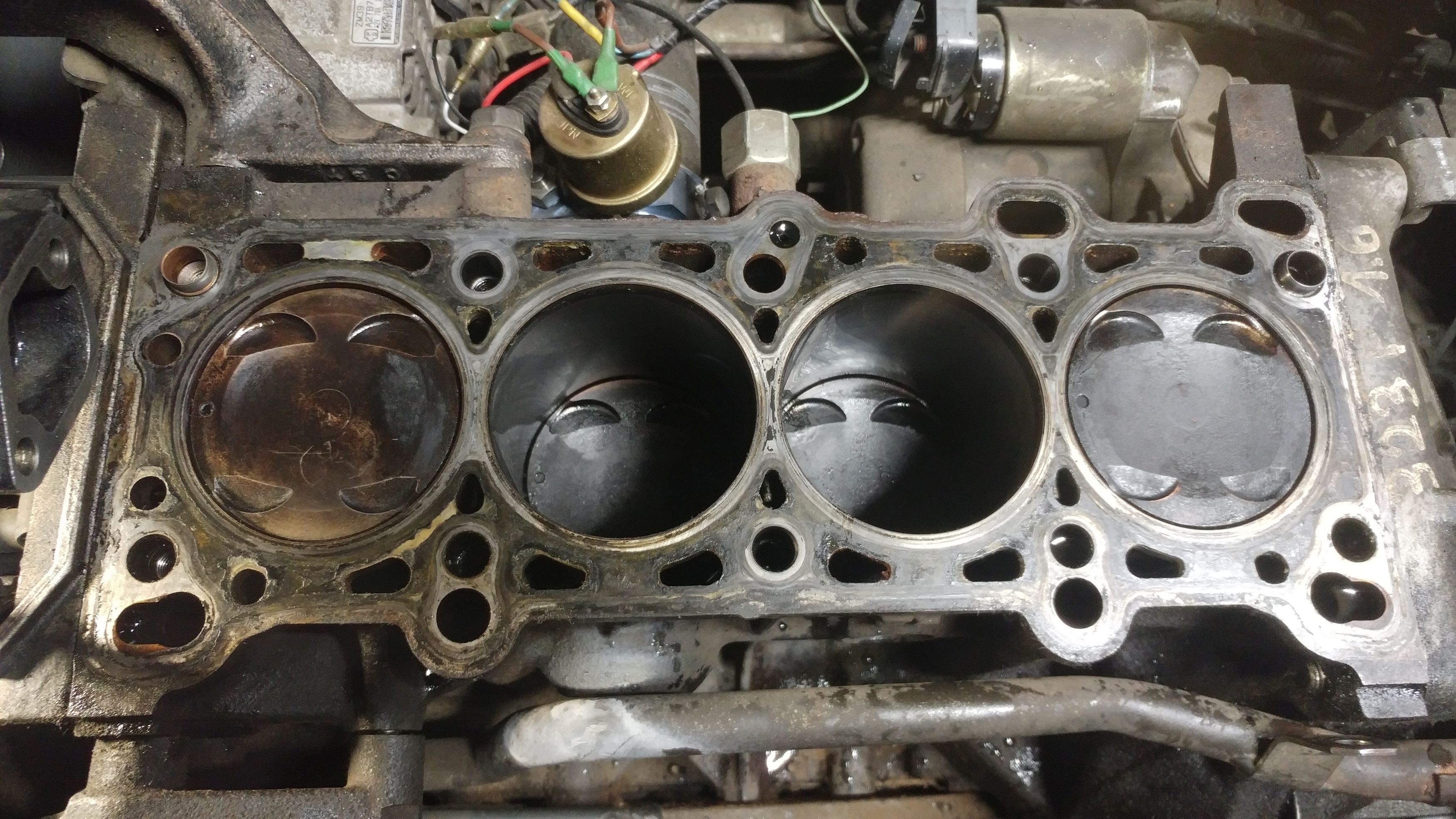 Na regale leży głowica z mojego poprzedniego silnika która jest w bardzo dobrym stanie i jest pewna, jeździła w dobrych warunkach tj. brak poboru oleju, bogate mieszanki i brak strzałów z wydechu a do tego prowadnice są ok i uszczelniacze są ok. Największą zagadką jest blok razem z tłokami, muszę wszystko pomierzyć czy nadaje się to do remontu, a nawet gdyby się nadawało to jestem wręcz pewny że będzie to dość luźne pasowanie. Załączam kilka zdjęć na których widać jak tragicznie wyglądały komory spalania, wszystko białe od oleju dosłownie