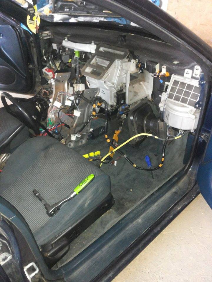 Tak jak mówiłem, że zabiorę się za tą nagrzewnicę. Jakaś wprawa już była w tym, bo raz już rozkręcane to było. No to w sumie dużo czasu na to nie miałem i się musiałem szybko uwijać, dlatego nie jest to wszystko elegancko poskręcane i spasowane, dlatego częściowo jeszcze kiedyś deskę rozkręcę, żeby już było wszystko ok :)). Przy okazji tego, że miałem to rozkręcone założyłem parownik od klimy, a resztą zajmę się innym razem jak znajdę chwilę czasu. Oczywiście parownik jest zaślepiony na otworach, żeby nic nie powpadało tam do środka :P