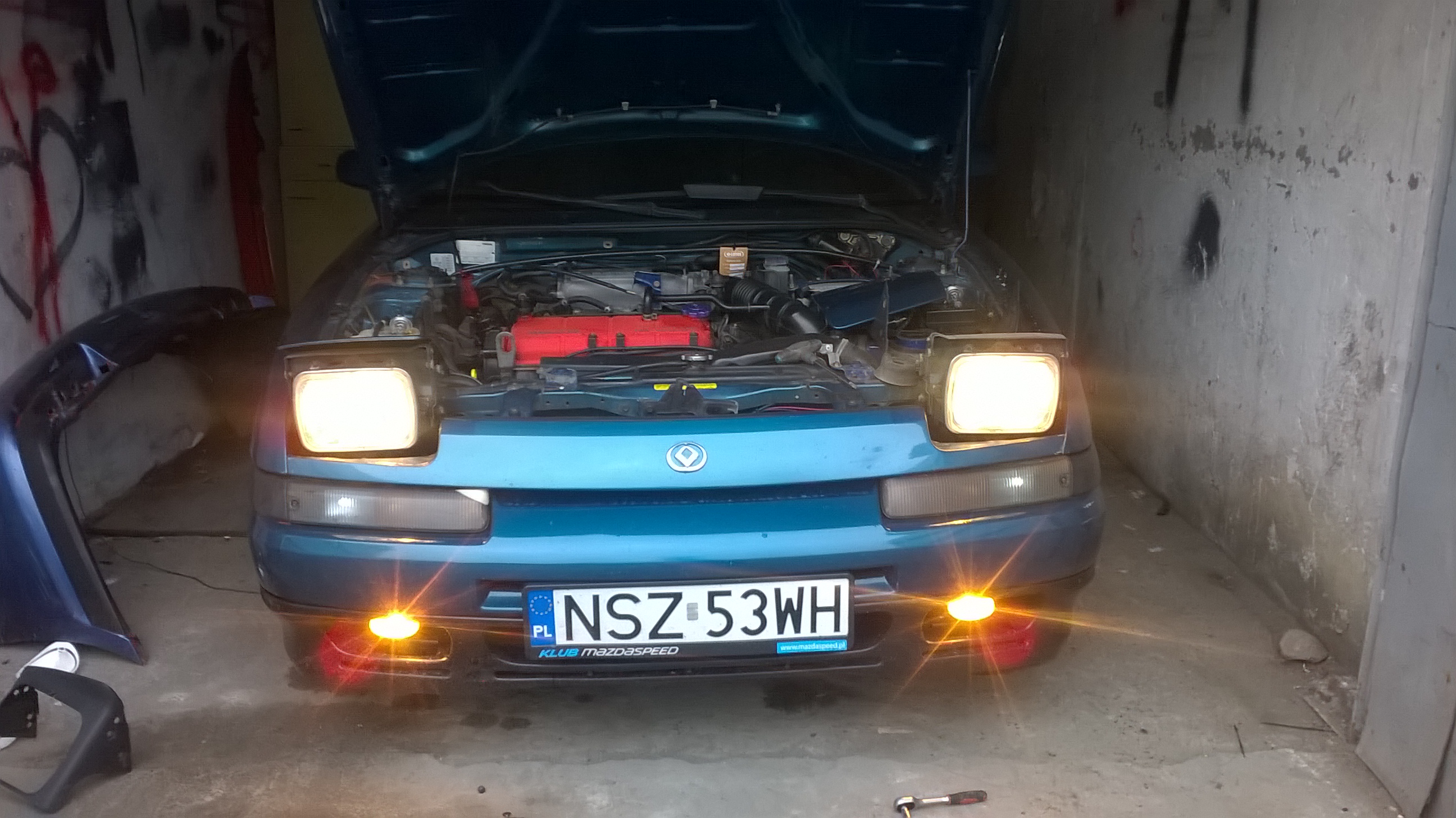 Dorwałem halogenki , które służą mi jako światła do jazdy dziennej. Dodatkowo okleiłem je folią holograficzną – żółtą . I odziwo policja się nie czepia ale pewnie do czasu aż nie trafi się taki co krzywo położony dywanik się przyczepi :-D Aby dodać jeszcze więcej wyglądu retro mojej Madzi zamontowałem też żarówki Bosma żółte retro style :–)