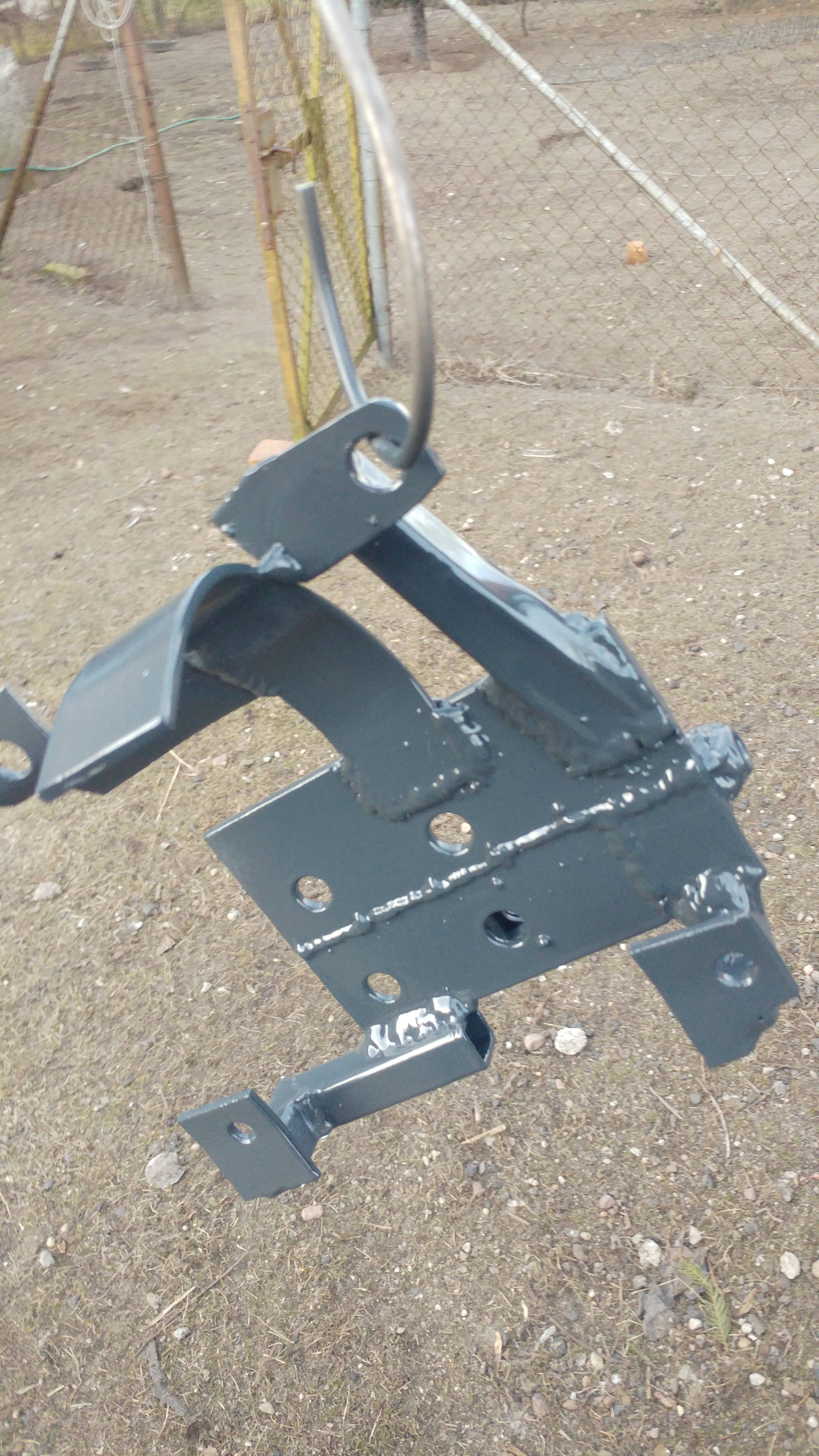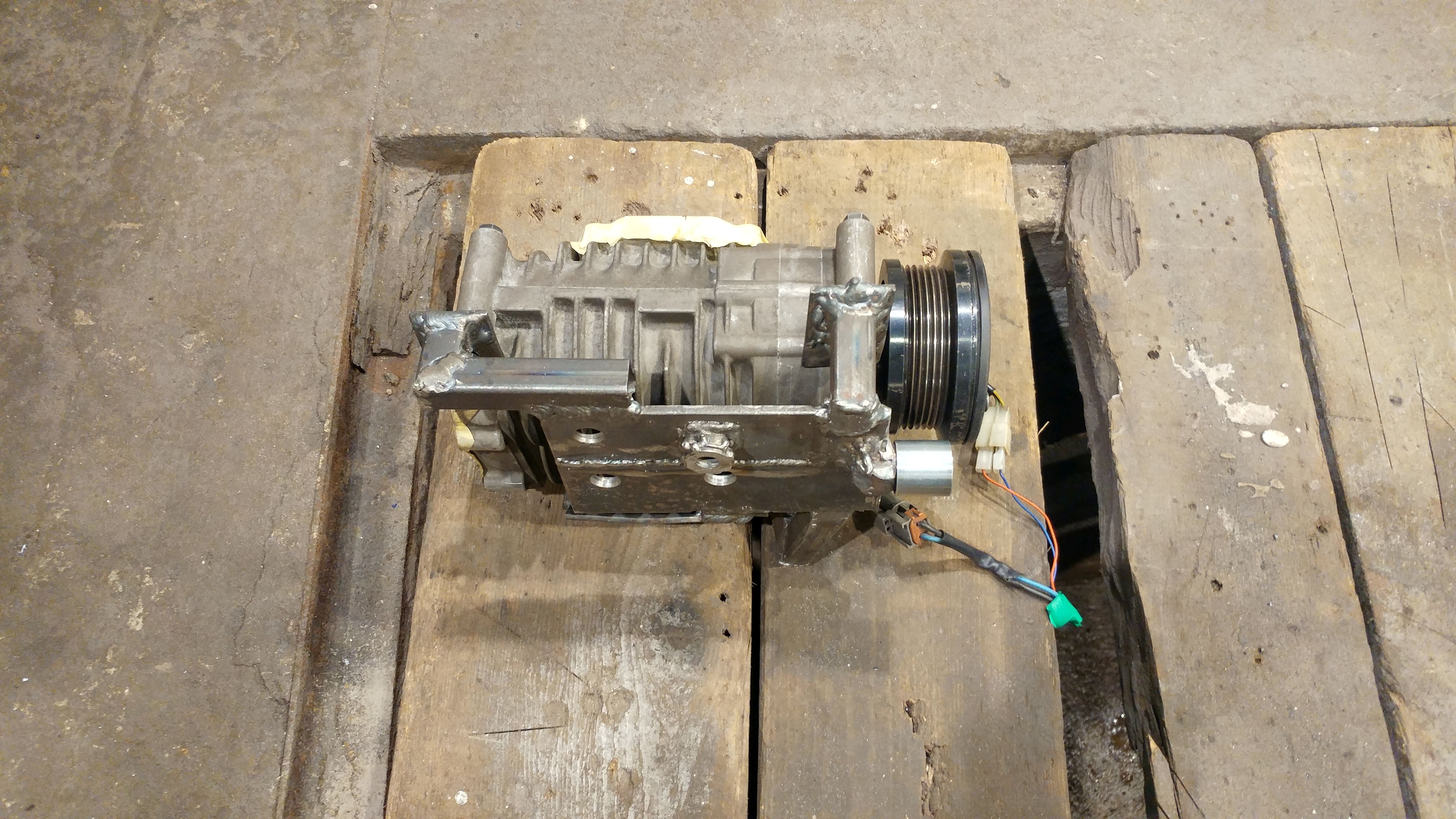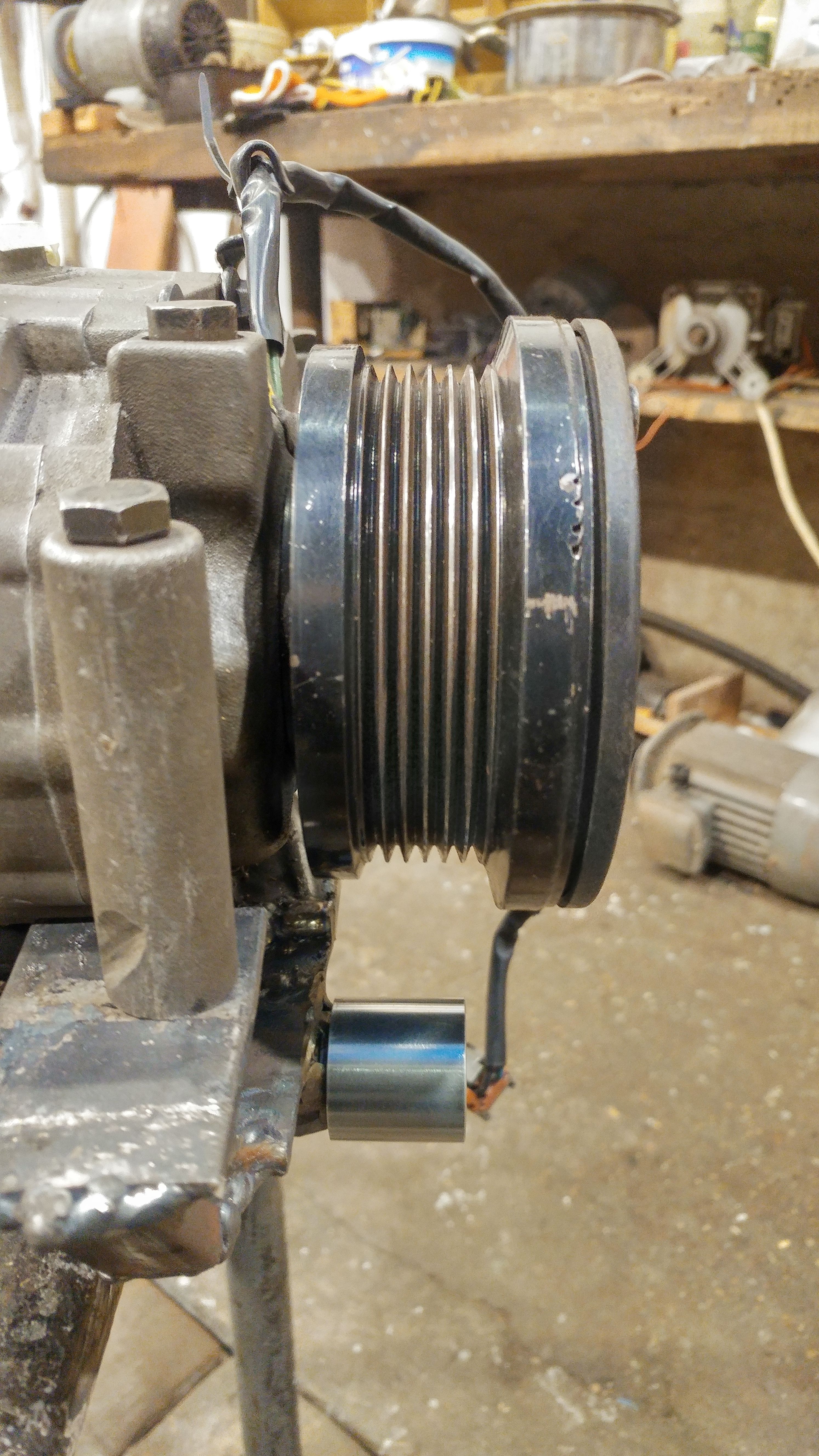Łapa kompresora praktycznie skończona. Dodana rolka prowadząca, żeby pasek 4pk opasał bardziej koło kompresora. Przyda się to gdy być może będę zmniejszał średnicę kółka na eatonie a i w tej chwili nie zaszkodzi. Wszystko powinno pasować a pasek powinien chodzić w linii prostej.