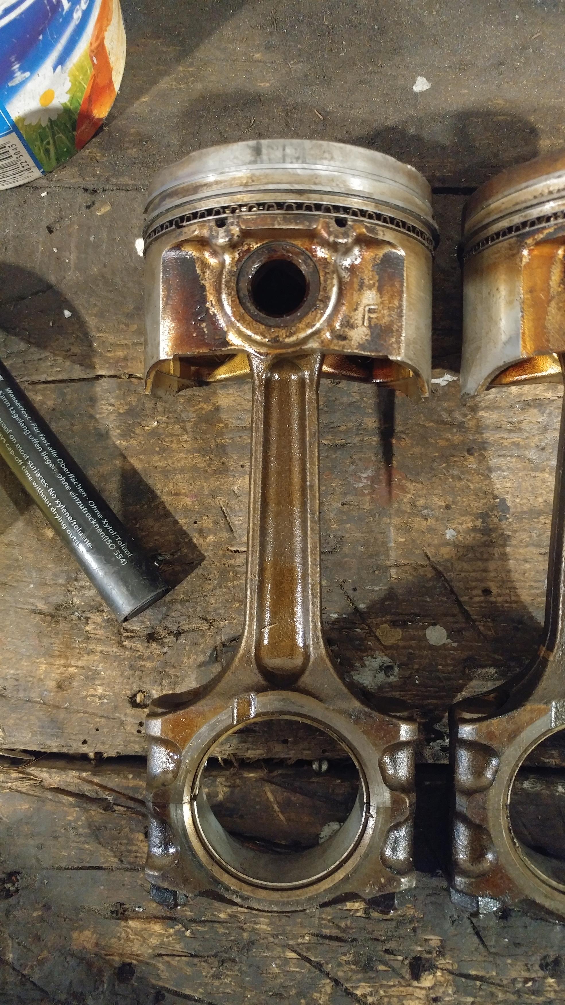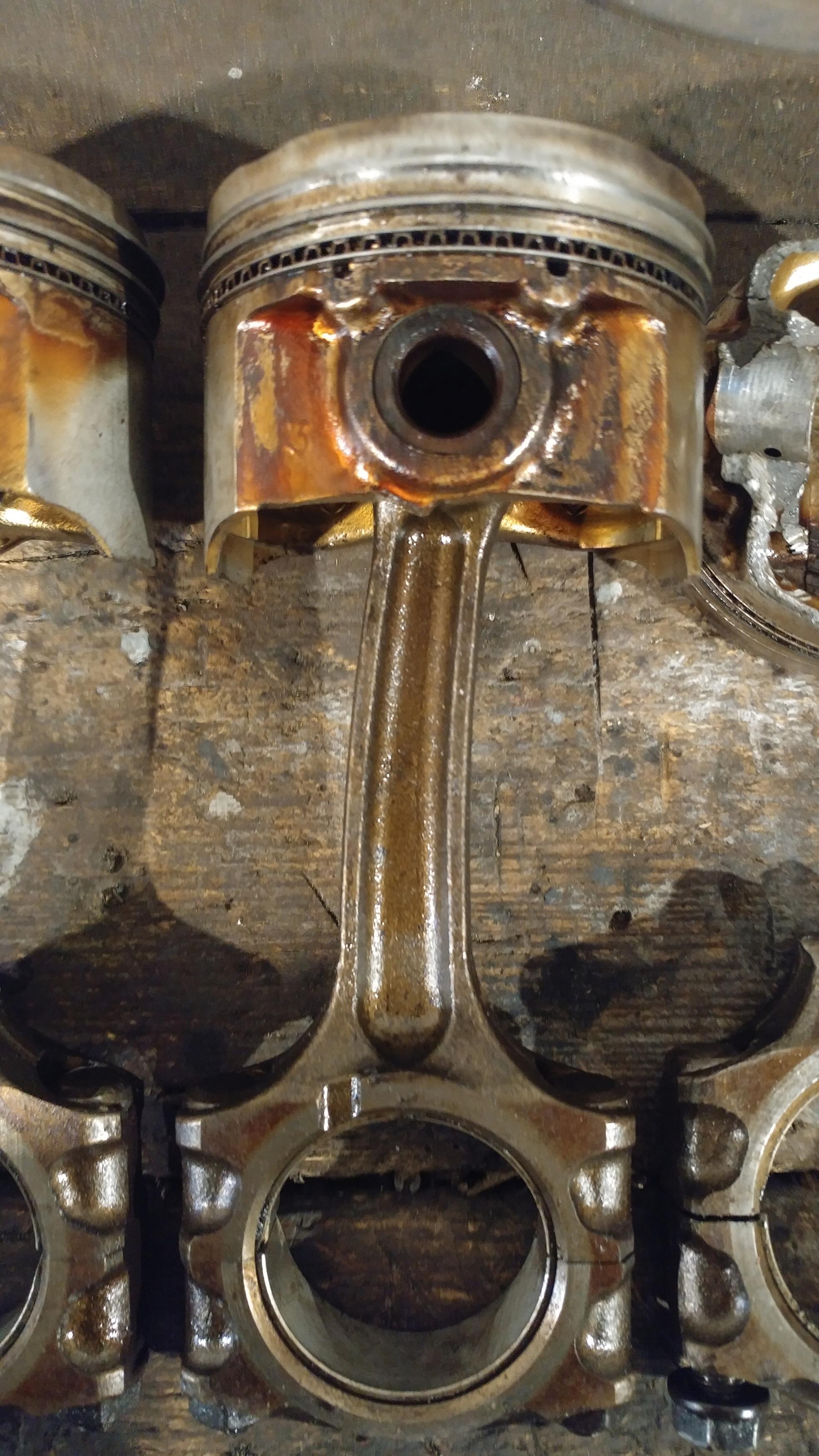 Tłoki praktycznie w idealnym stanie, gdyby nie przytarcie na tłoku z 1 cylindra to nadawałyby się wszystkie 3 do ponownego użycia, pierścienie niezapieczone i nie noszą śladów zużycia nawet.