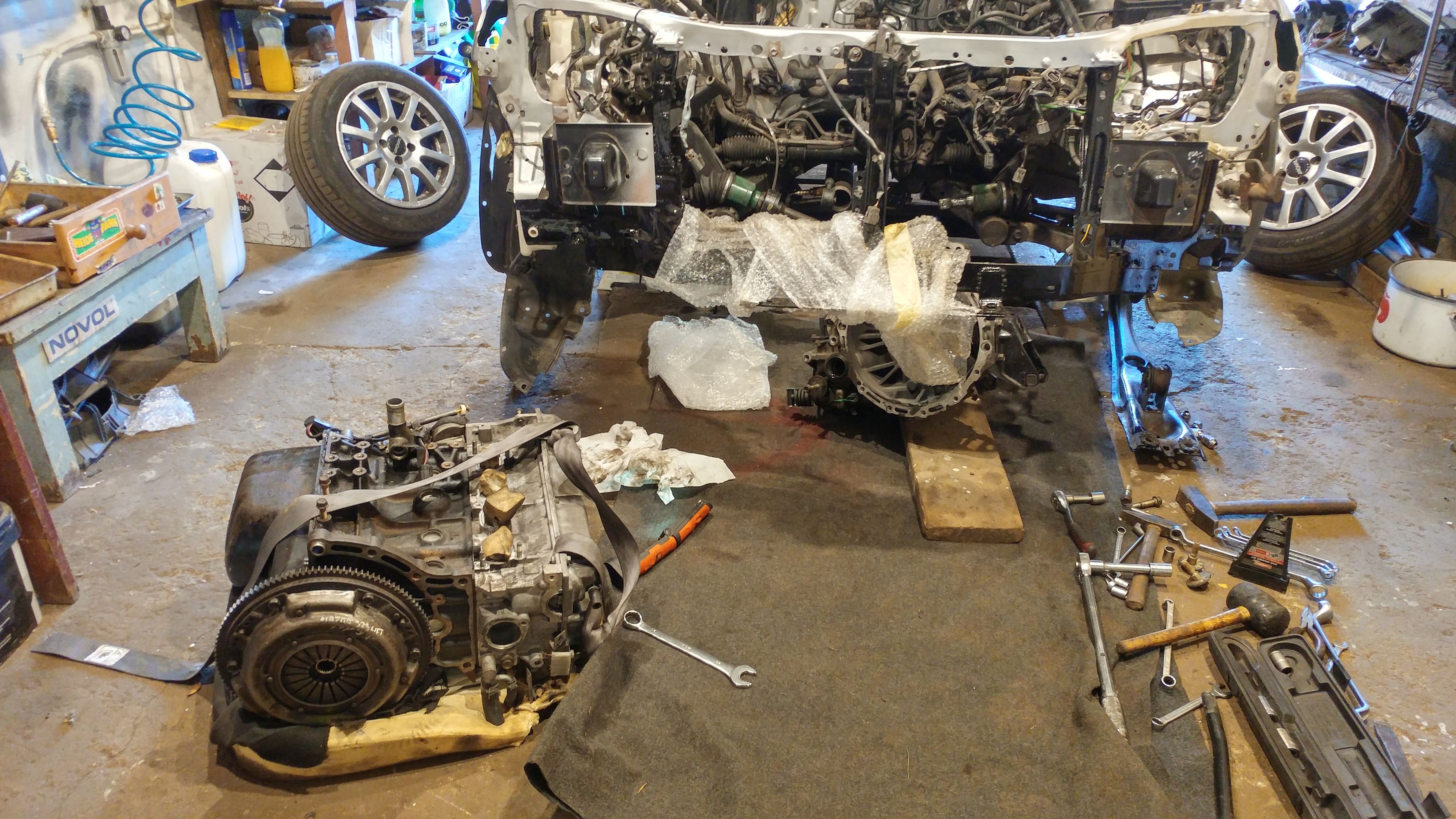 Nie zatrzymuję się, będę rzeźbił dalej, silnik wyjęty więc jest okazja aby ogarnąć trochę komorę bo można dostać oczopląsu patrząc na nią, na pewno trzeba uporządkować wiązki kabli oraz węże, jakieś czyszczenie a do tego podmalowanie ognisk rudego zanim zawita nowy silnik. A następny motor myślę, że będzie delikatnie odprężony "kanapką", i jedynie tyle. Kucizny nie wstawiam bo raz kasa, dwa kasa a trzy to nie jestem pewien wymiarów korb, nie mam nawet jak zwymiarować tych wyjętych z silnika bo wszystkie są pokrzywione