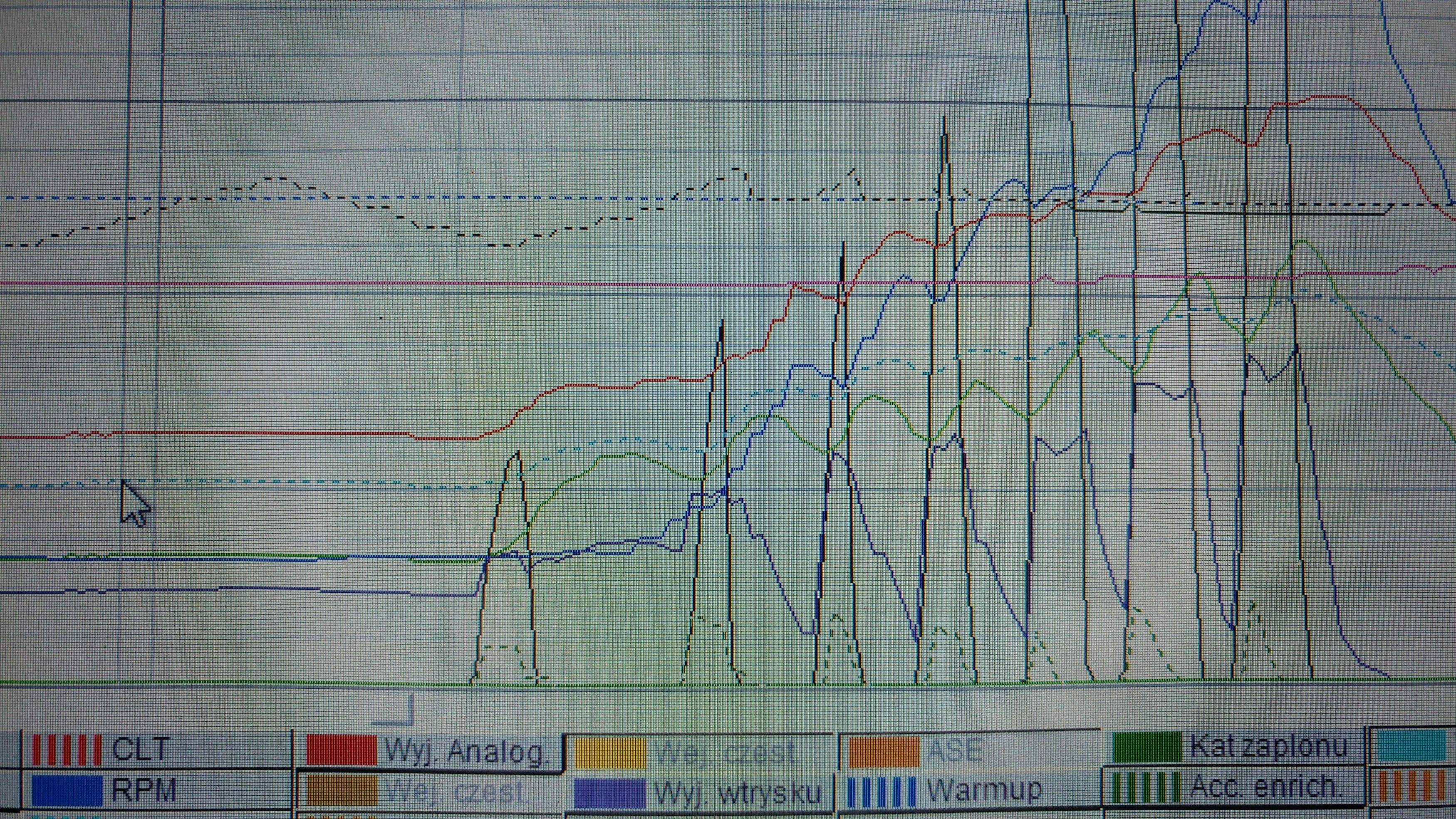 - To jest log z felernych zapłonów które zaowocowały wybuchem korby. Zielona linia to map sensor, czarna to TPS czyli wciskanie gazu a czerwona to wyjście analogowe które pracuje dla ECU jako przepływomierz. Jak widać map sensor ma opóźnienie działania względem tps a sygnał czerwony jest uzależniony od odczytu Map sensora, stąd pogubione zapłony i korba bokiem