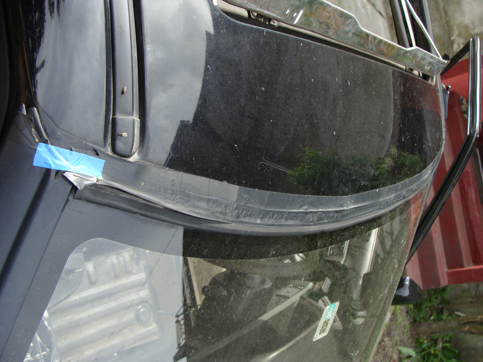 Dowiedziałem się skąd w aucie zapach stęchlizny... Jest przeciek przy przedniej szybie, prawy górny róg. Rdzy tam trochę jest, także dokładnie nie wiem jeszcze czy to tylko uszczelka czy dziura w dachu. Poprzedni właściciel zakleił cały początek dachu czarną taśmą, przynajmniej wiem dlaczego.