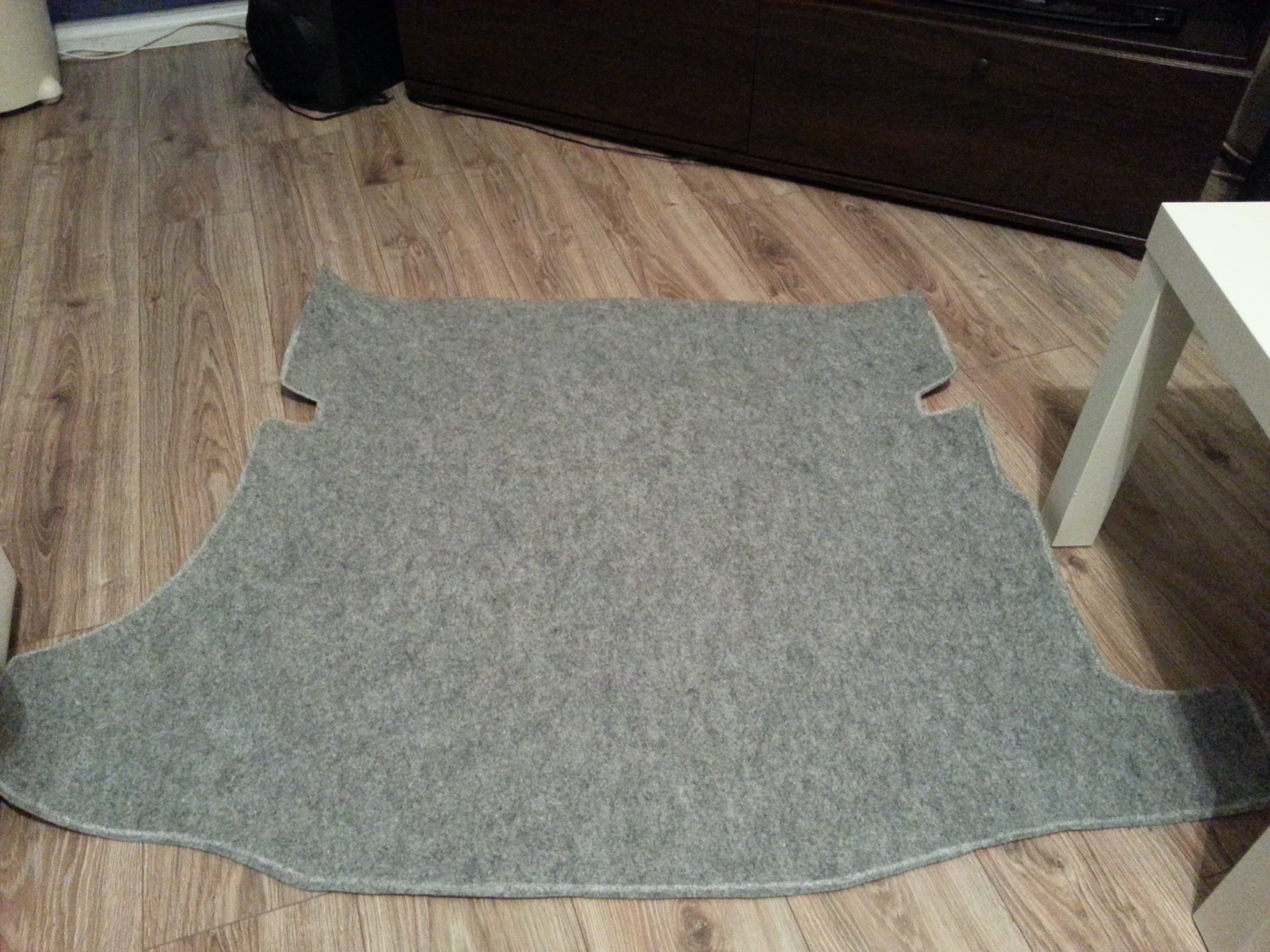 Pierwszy pomiar i obrys wykonany na podstawie dotychczasowej podłogi bagażnika okazał się być do bani i tylko zmarnował wykładzinę. Drugie podejście okazało się być bardziej udane, bowiem odrysowywałem od podwyższanej podłogi, w dodatku ze sporym zapasem na błąd. Tym razem pełen sukces