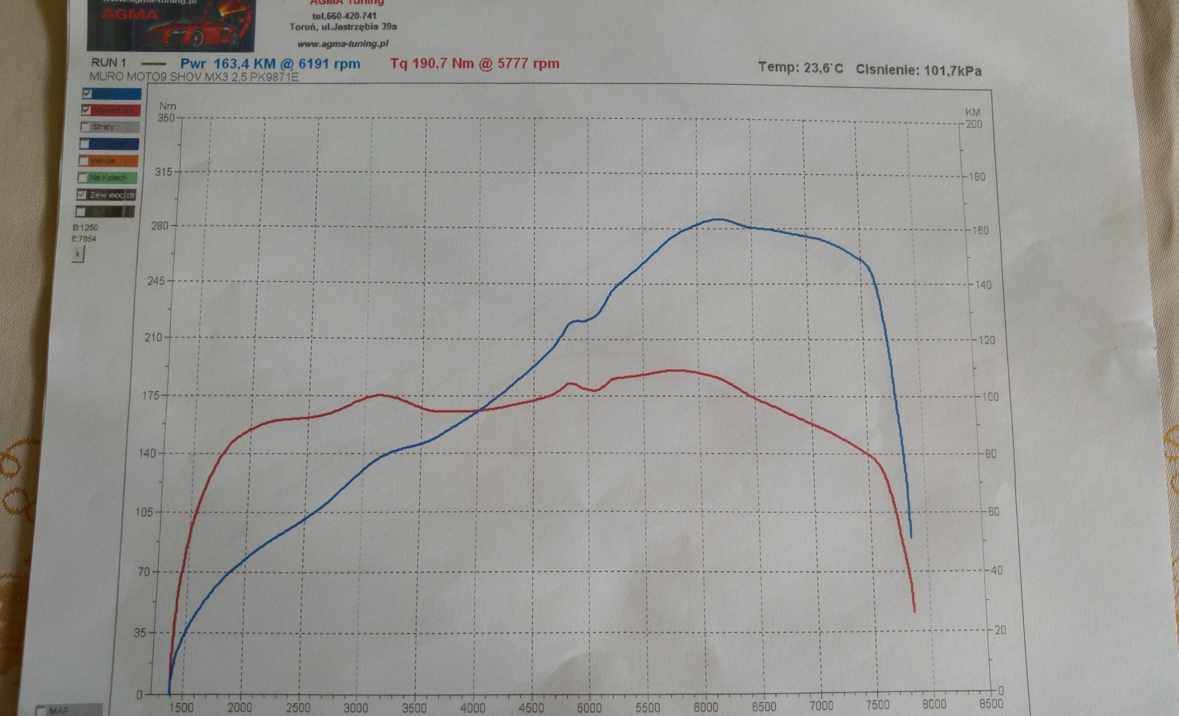 Dzisiaj mazda wleciala na hamownie z racji tego że w moich okolicach odbył się zlot motoryzacyjny. Hamownia jest dokładnie taka jaką klub mazdaspeed wypożycza na swoje zloty czyli agma tuning z Torunia. Zrobiłem łącznie 3 pomiary dwa były na kompach KL jeden oznaczenie kl55 drugi kl05 pierwszy poliftowy drugi przedliftowy a trzecie te które mnie najbardziej zadziwia zostało dokonane na kompie od k8 wynik jako uzyskałem przechodzi myślę pojęcie i tu proszę o wytłumaczenie mi z czego ten wynik się wziął. Na kompach KL jeżeli chodzi o moc pokazał silnik ładna serię moment trochę za mały Ale nie wiem w sumie czego to wina. Nie przedłużając wrzucam wykres z hamowni i podziwiajcie