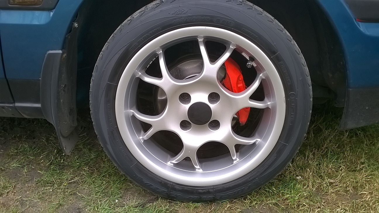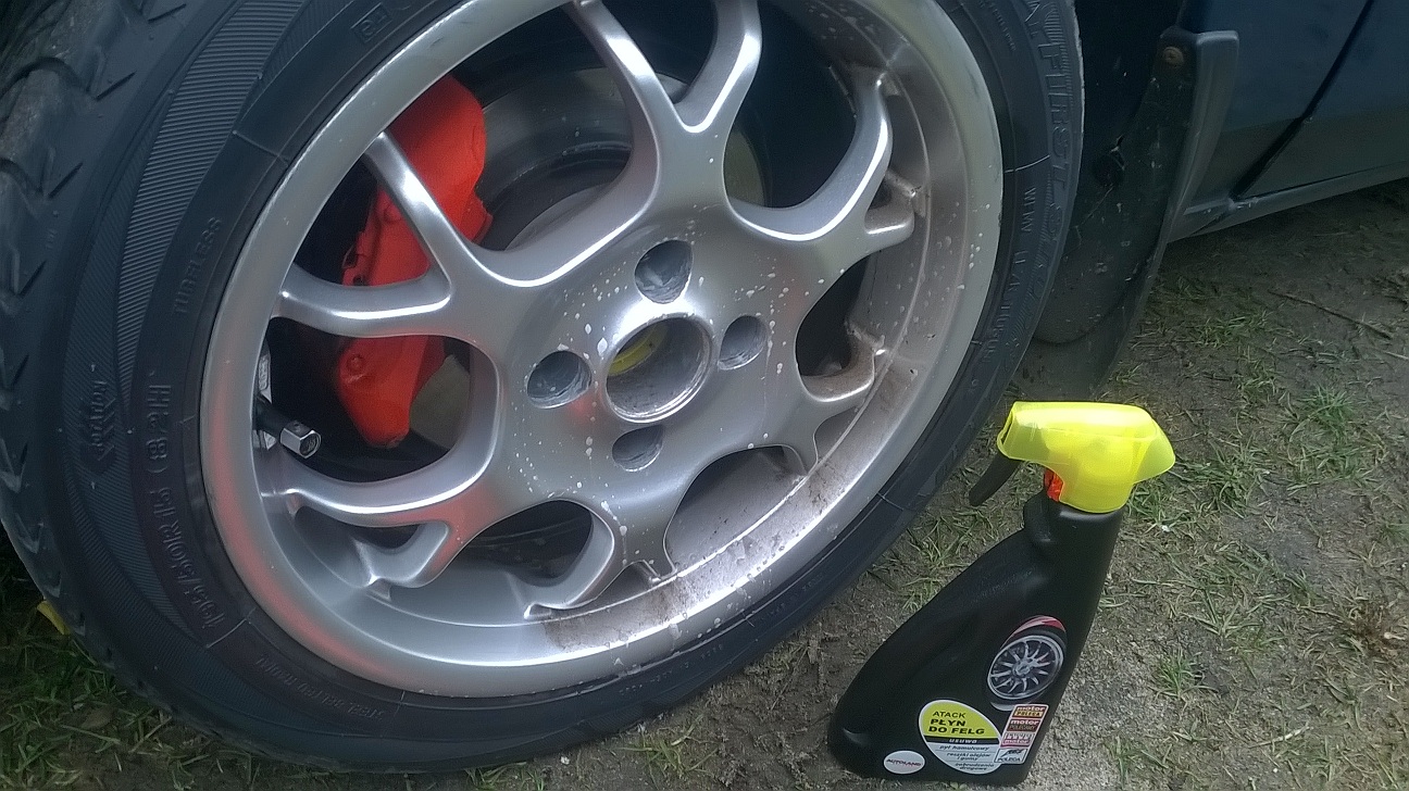 Dziś postanowiłem zająć się aluskami . Były zczrniałe i brudne. Zakupiłem w tesco fajny preparat do mycia felg i powiem że robi robotę :–). Oczywiście oponki też zostały wypolerowane i mogę się pochwalić nakrętkami na wentylki mazdaspeed