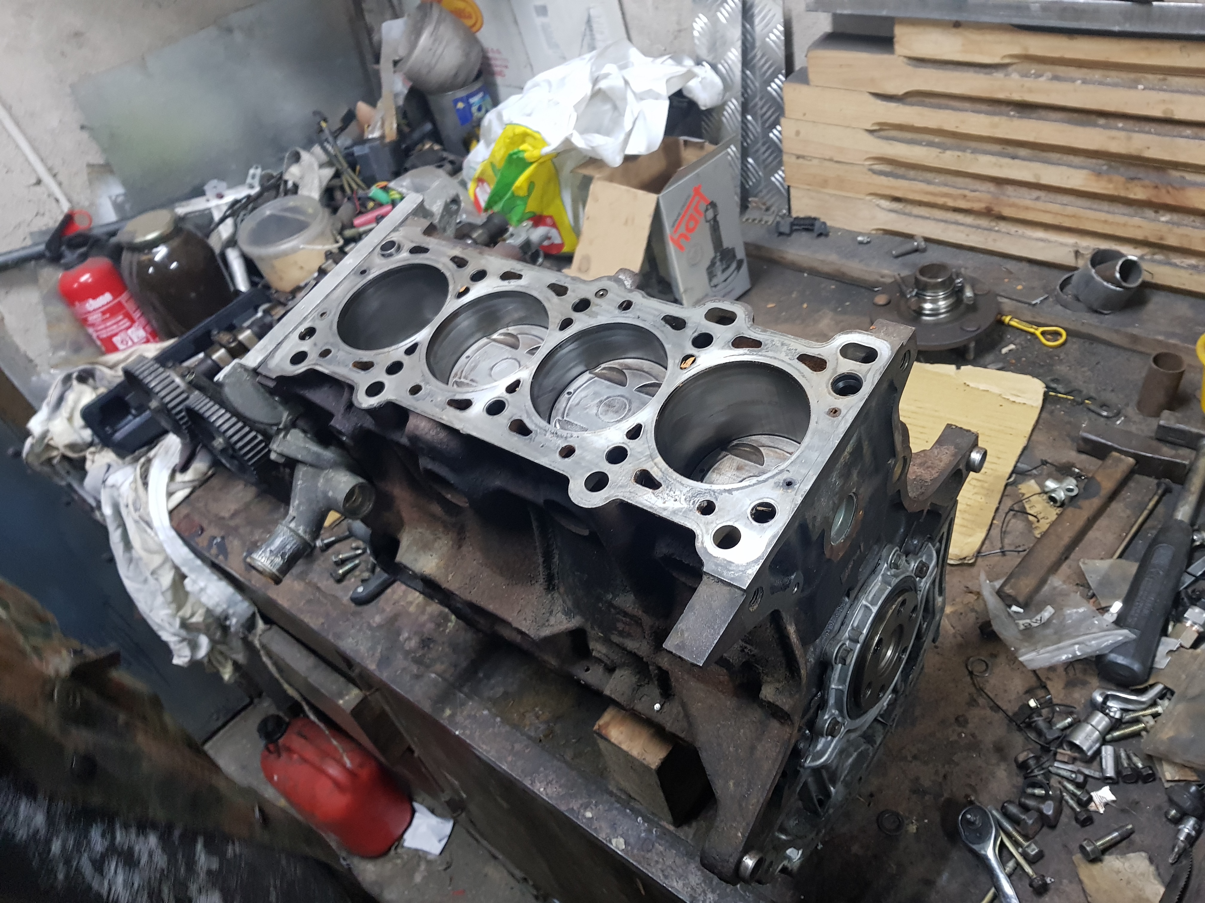 Silnik został dokładnie wyczyszczony i dostał komplet nowych uszczelek i uszczelniaczy. Panewki były w zasadzie w stanie idealnym więc nie były ruszane, pierścienie były trochę zapieczone więc cały nagar został wyczyszczony, zawory i gniazda zaworowe zostały podocierane już wcześniej, luzy zaworowe zostały wyregulowane (doszlifowanie płytek). Dodatkowo założyłem sprężynki na sztangę wastegate i ciśnienie doładowania spadło do ~0,85-0,9 bar.