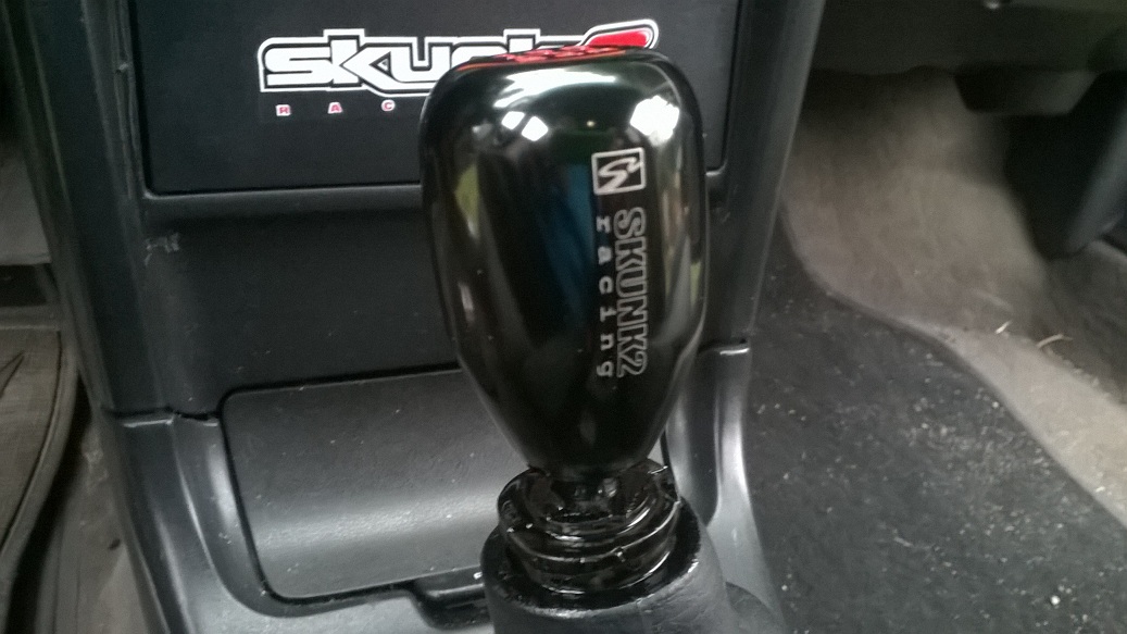 Dokładki będą zrobione pod kolor i na gładko. Od razu pod kolor pomaluję czarne pasy na drzwiach . Tylko obecnie wyczerpały się fundusze więc jeżdżę tym co mam :–/... Dziś jednak wpadła gałka zmiany biegów Skunk2. Niestety gwint słabo pasuje ale udało się wkręcić dosyć mocno i nie rusza się . Zrobiłem od razu ze starej gałki mocowanie na mieszek ponieważ w tej gałce nie było i była dziura :-D! Wygrzebałem też z rupieci nakładkę na lampę , sticker wyleciał :–) Teraz jest czysto i prosto