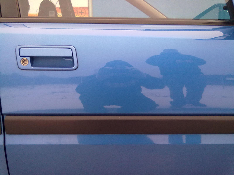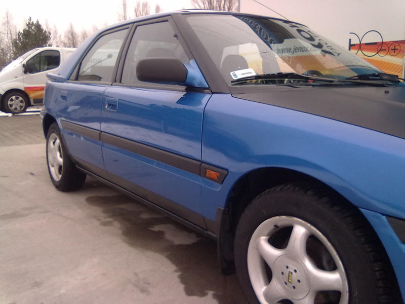 Maskę, klapę oraz lusterka mam oklejoną czarną folią 3M – czarny mat, do tego zrobiłem podgrzewane lusterka, dałem wstawić korek wstydu (LPG)zamontowałem alarm wymieniłem przewody i świece na NGK, koła 14 cali w amelinium :)