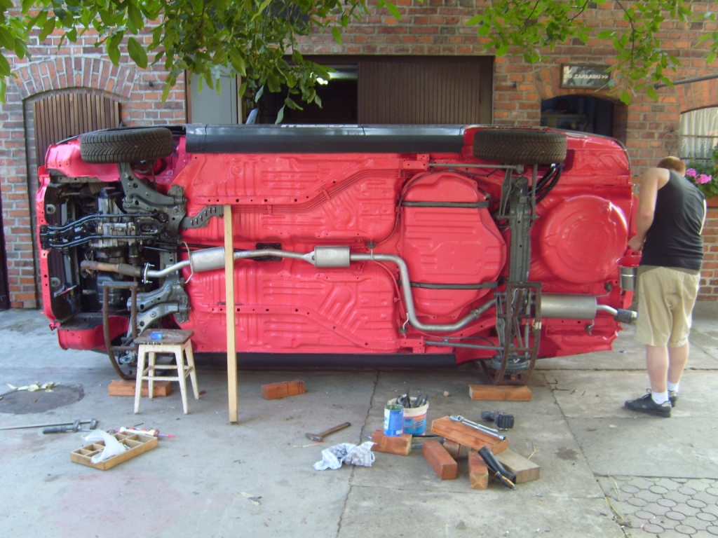 Do zrobienia było sporo – wymiana tarcz i klocków na przód, regeneracja tylnych, bębnowych. Przegniła rura wlewu paliwa, odpowietrzniki, konieczna wymiana na nowe, nowy bak, no bo nie dało się zatankować do pełna i już. Radio na sto tysięcy kostek, że nie mieściło się do kieszeni. Do pospawania była wnęka na koło zapasowe (tak, stała w niej woda), nadkole. Do konserwacji całe podwozie, progi do malowania. Uszczelka pod głowicą do wymiany. Oleje, płyny, filtry, wiadomo. Obowiązkowe było obszycie fotela kierowcy ze względu na spore przetarcie no i pranie wszystkiego, co się wyprać dało. Płyta w bagażniku zrobiona od nowa, co by udźwignęła sprzęt grający. Chłodnica wymieniona, bo stara była pęknięta. Bagażnik wygłuszony matami, żeby wszystko ładnie grało. Klapa od bagażnika wymieniona, bo na starej już zaczynała wychodzić rdza. Nowe sprężyny -35mm, bo jedna ze starych pękła. Chyba wszystko.