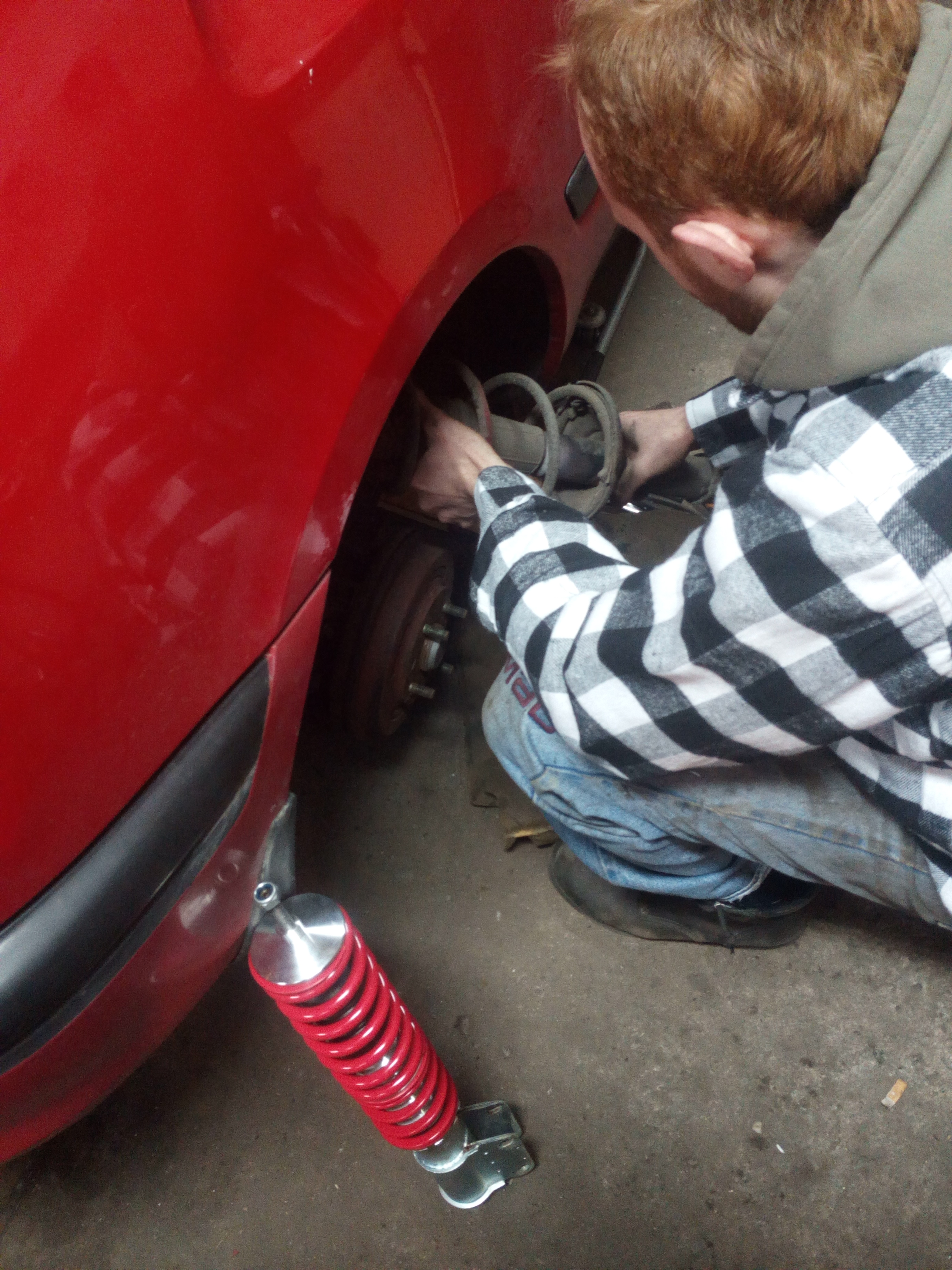 Za dużo to tam się wymyśleć nie dało. Z przodu został przycięty i obrobiony talerzyk trzymający sprezyne gwintu żeby pasowało do niego łożysko poduchy, no i sama poducha tez musiała być przycięta by talerzyk wszedł. Z tyłu to już tylko talerzyk gwintu przycięty i gotowe.