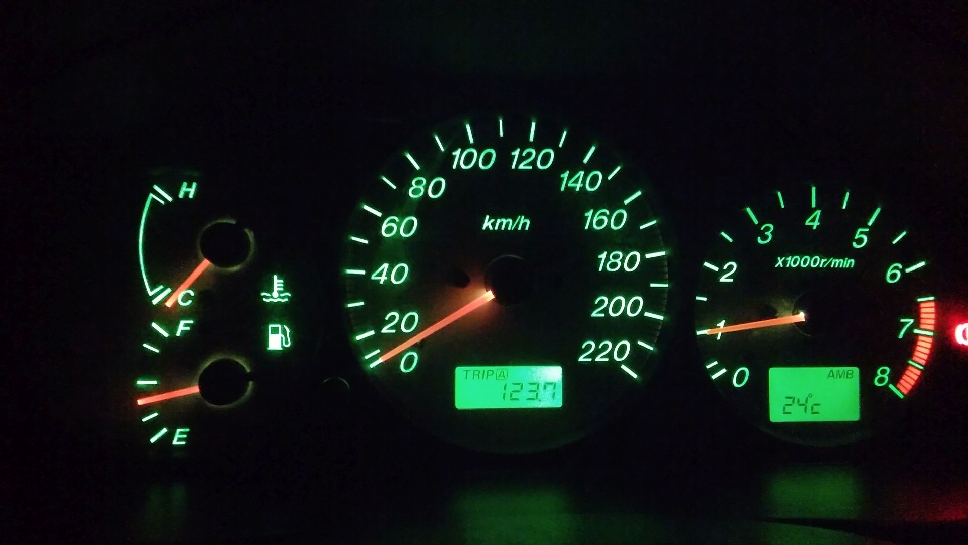 A więc jak wspomniałem gdzieś wcześniej że lubię wyraźne zegary to któregoś popołudnia wymieniłem a w zasadzie wzmocniłem oświetlenie tzw "szafy" :D Do poprawy tegoż oświetlenia użyłem zwykłych żarówek gdyż ledowe nie dały pożądanego efektu. Do podświetlenia wskaźników służą 4 żarówki, dwie duże bańki 1,7W i dwie malutkie 1,2W. Ja zastosowałem w miejsce dużych żarówki W5W a w miejsce tych małych 2,3W. Oczywiście założyłem zielone kapturki jak były fabrycznie, bałem się czy żarówki W5W nie stopią ich ale jeżdżę już tak któryś ładny dzien i nic się nie dzieje. Jakość nie powala robione telefonem, w rzeczywistości wygląda to lepiej. Te smugi to niedokładnie wytarta szybka ;) Oto efekt w nocy: