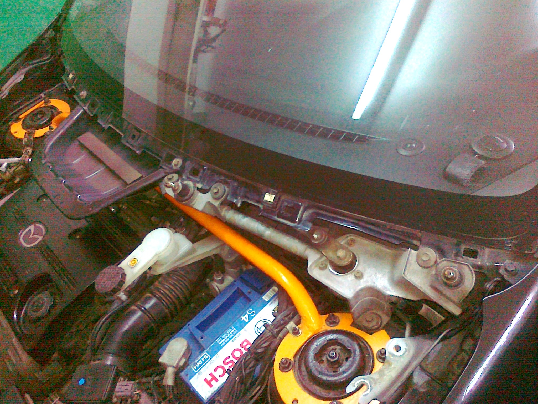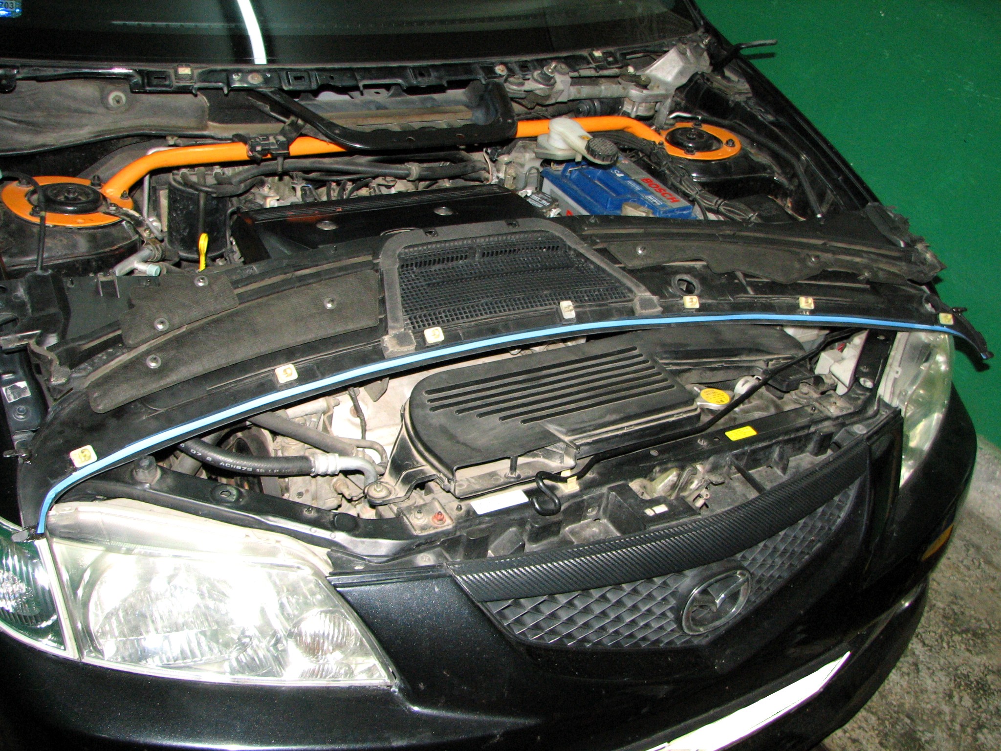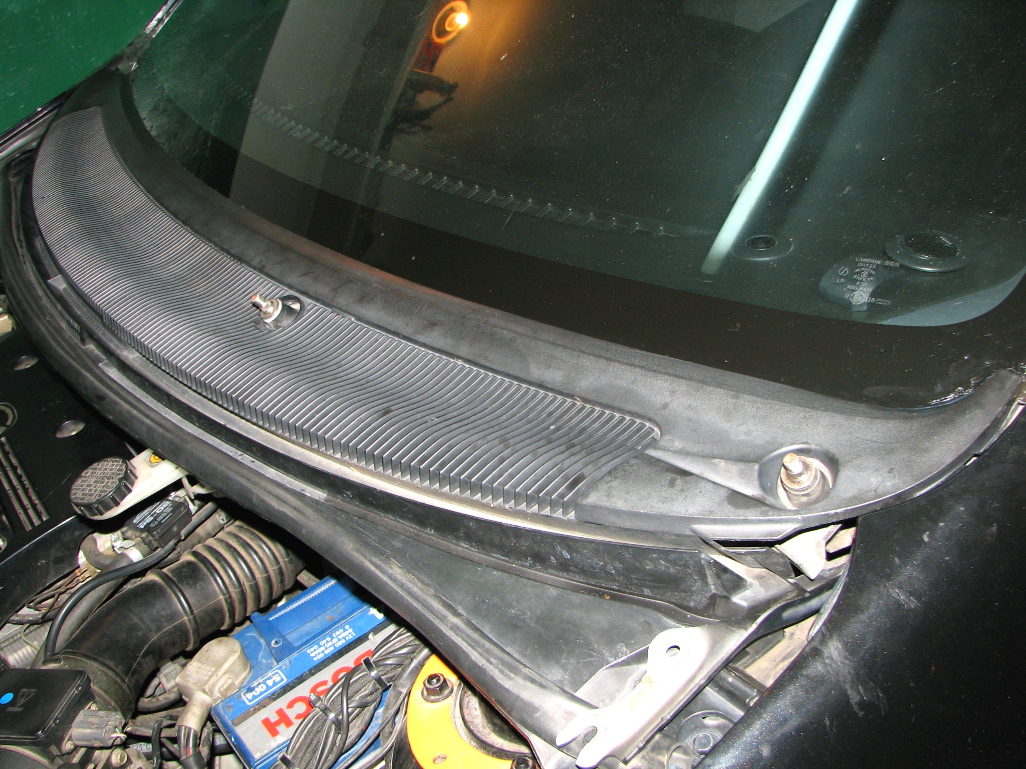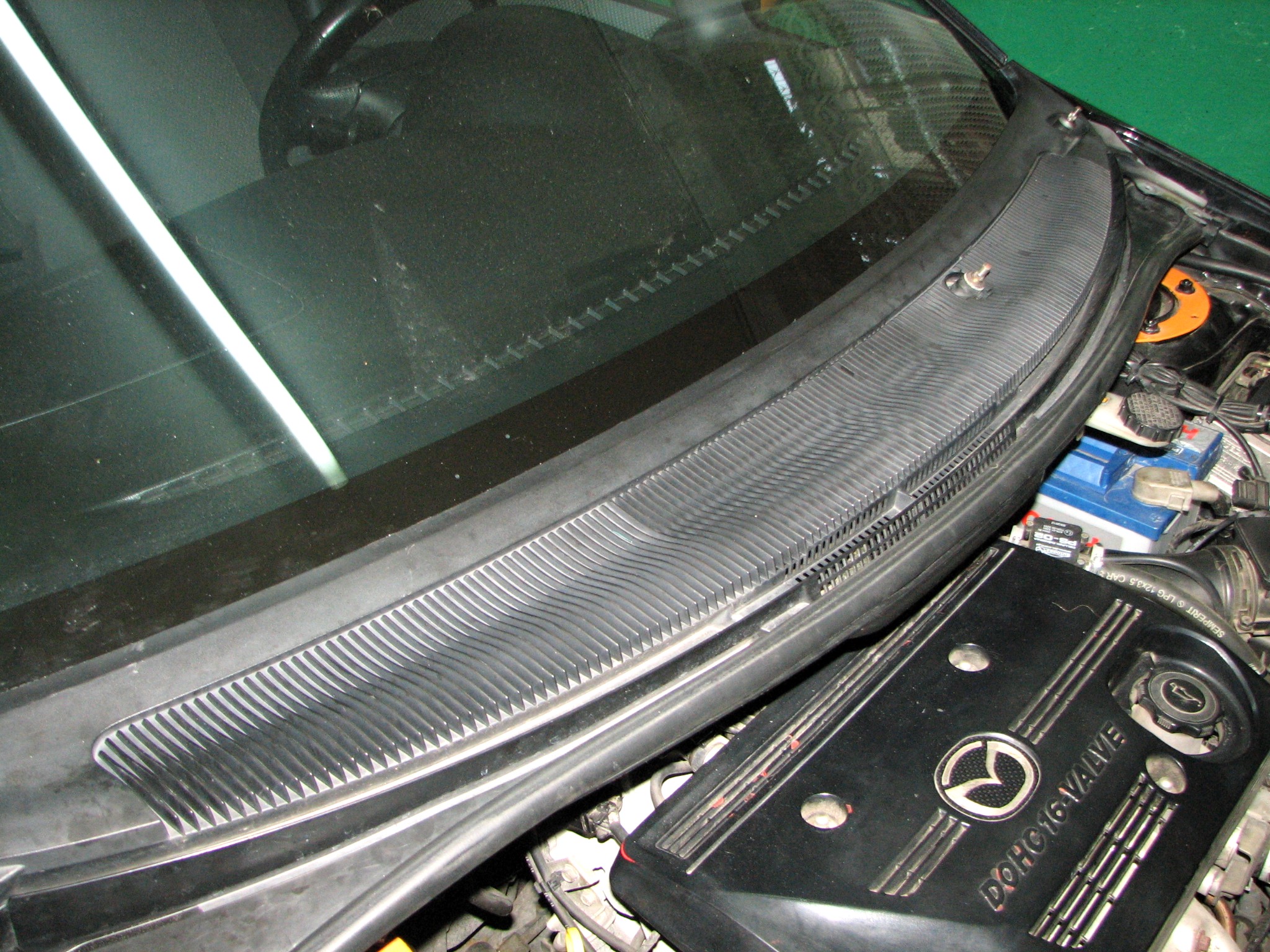 Od jakiegoś czasu miałem problemy z pojawiającą się wodą w komorze silnika (akumulator i jego okolice), z czasem woda pojawiła się również w kabinie od strony kierowcy pod nogami (wykładzina pod dywanikiem była wilgotna). Zjawisko to było zauważalne przede wszystkim po deszczu – stąd inne płyny "ustrojowe" zostały wyeliminowane z podejrzeń (niczego nie ubywało). Okazało się, że winne temu było nieszczelne podszybie. Część wody z przedniej szyby zamiast spływać po podszybiu do rynienki pod maską i do otworów odpływowych, wpływała do powstałych szczelin między podszybiem a szybą. Z komory silnikowej wpływała po części do kabiny pod nogi kierowcy. Jakiś czas walczyłem z tym poprzez uszczelnianie m. in. klejem do szyb, silikonem itp. ale niestety działało to tylko jakiś czas, warunki atmosferyczne (głównie słońce) odkształciły podszybie na tyle, że doraźne sposoby na niewiele się zdały. Zdecydowałem się na demontaż podszybia, aby zrobić to jak należy. Konstrukcja samego podszybia w premacy jest wg. mnie wadliwa choćby dlatego, że jest jednoczęściowa tzn. pełni rolę osłony jak i rynienki odprowadzającej wodę jednocześnie. Nie ma rynienki pod podszybiem jak w większości innych samochodów, przez to, jeśli woda znajdzie nieszczelność w okolicach przedniej szyby, cieknie do komory silnikowej i dalej...