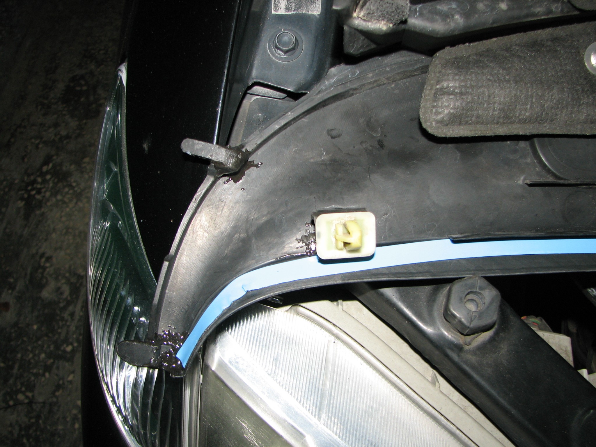 4. Zatrzaski skleiłem mocnym klejem dwuskładnikowym (tzw. spawanie na zimno), miejsca po starej taśmie-uszczelce zostały oczyszczone i odtłuszczone benzyną ekstrakcyjną (na podszybiu jak i na samej szybie również). Przykleiłem nową mocną taśmę (najlepiej kupić koloru czarnego, nie będzie później widoczna spod podszybia) na całej szerokości rantu, który styka się z szybą (na fotce jest pierwsza warstwa, a rant ma około 1,5cm szerokości). Wystające resztki taśmy obciąłem ostrym nożykiem.